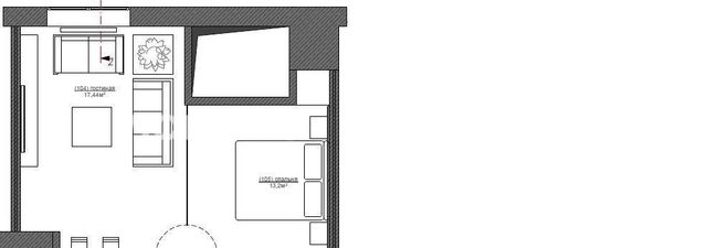Планировка включает в себя: кухня-гостиная, спальня, санузел, гардеробная.