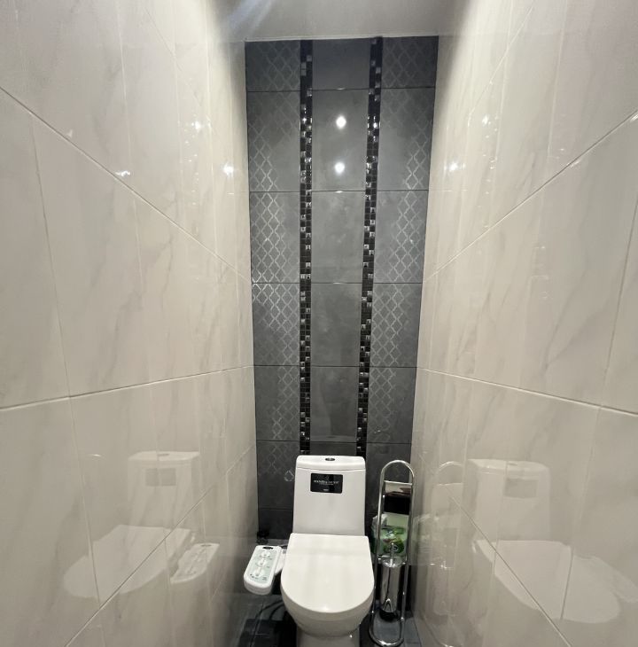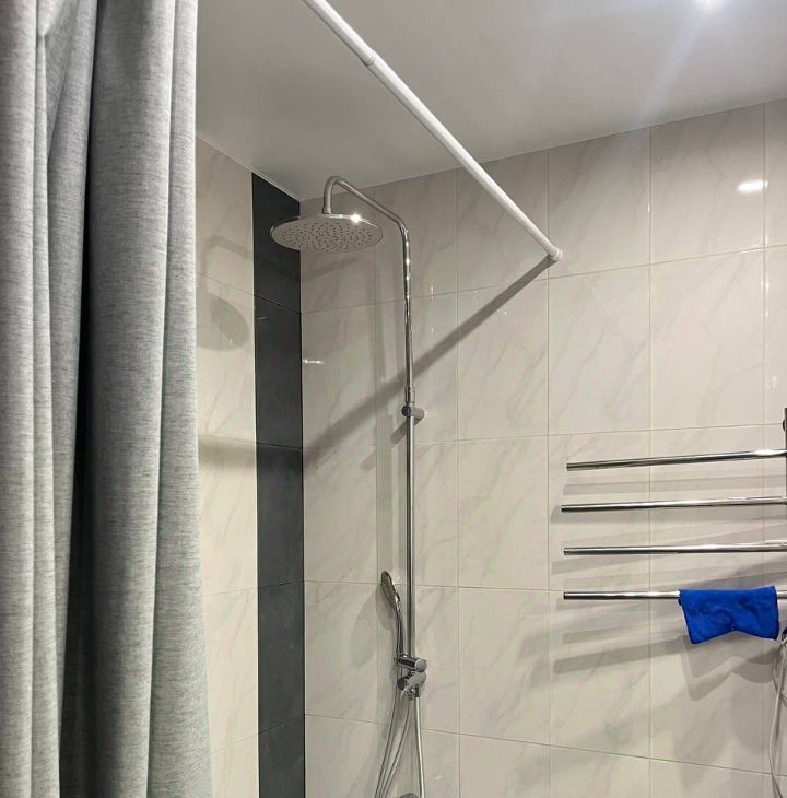 Санузел раздельный, с длинной ванной, высоким душем и биде.
