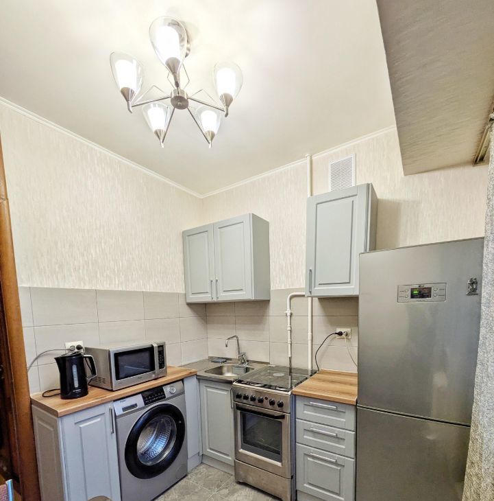 Оснащена всей необходимой техникой ( большой двухкамерный холодильник, стиральная машинка, газовая плита с духовным шкафом) и мебелью (двуспальная кровать 160*200, раскладное кресло, удобные места для хранения — большой просторный шкаф,кладовка,антресоли; обеденная и рабочие зоны).