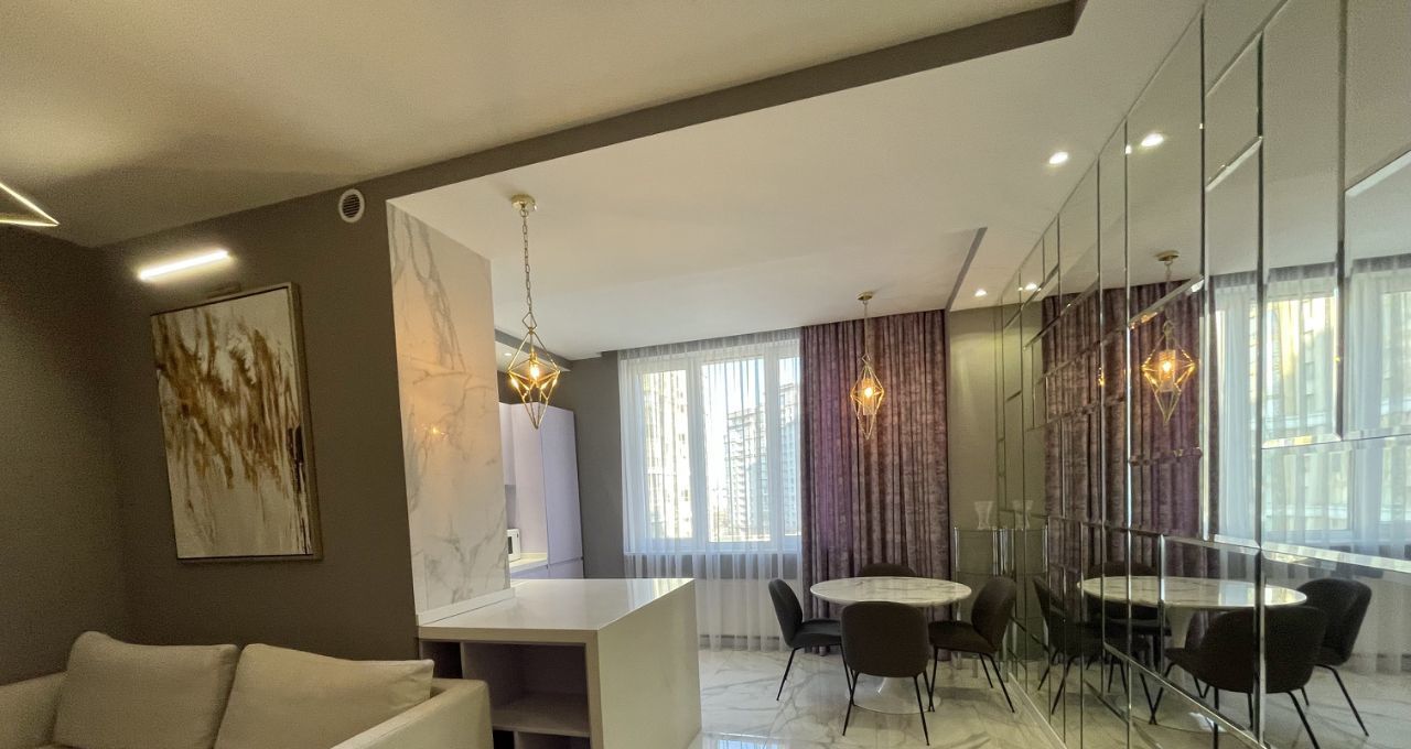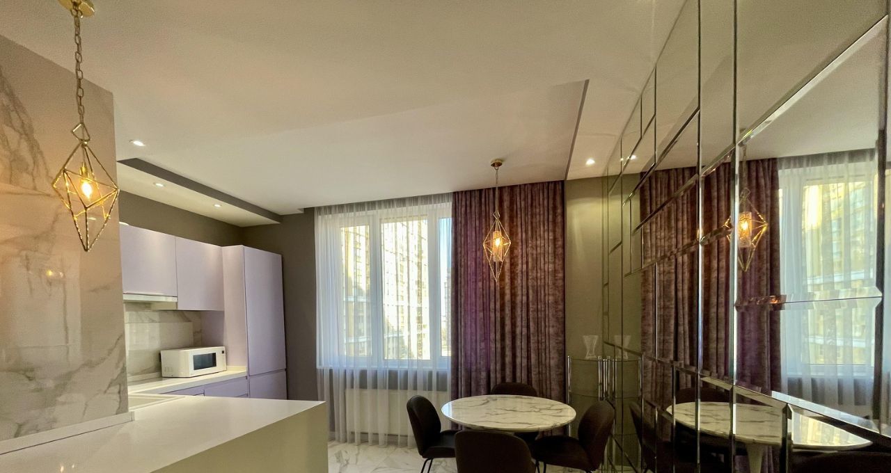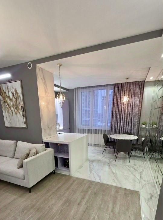Просторная кухня гостиная площадью - 25 ,2 кв. м, оборудована всей необходимой мебелью и техникой: холодильник, посудомоечная машина, кондиционер, а также уютная обеденная зона.