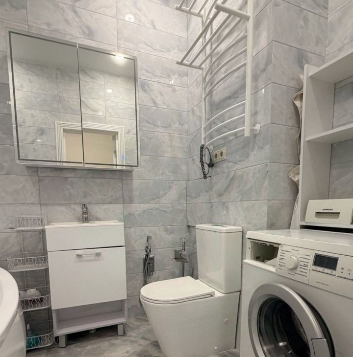 Просторная прихожая, гостевой санузел, зеркало в полный рост и кухня-гостиная - встречают Вас. Кухня оборудована необходимой бытовой техникой.