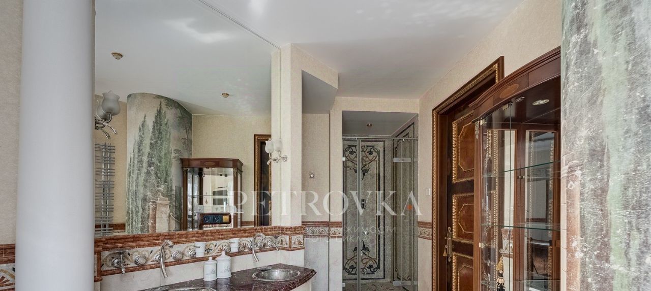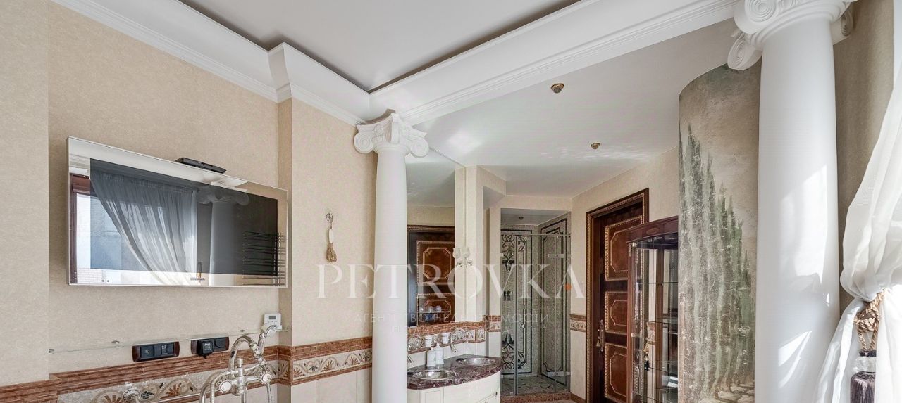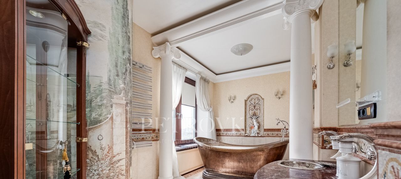 Мастер-спальня с видом во двор, большая гардеробная с окном, большой санузел с медной ванной, душевой, телевизором и мозаикой.