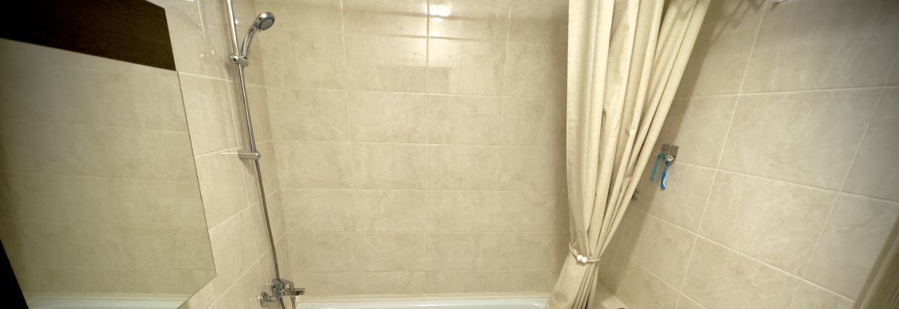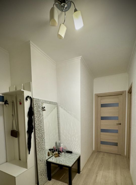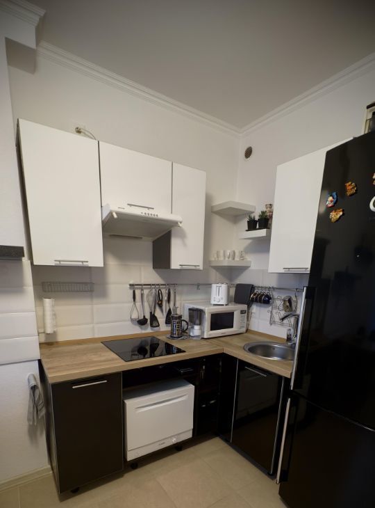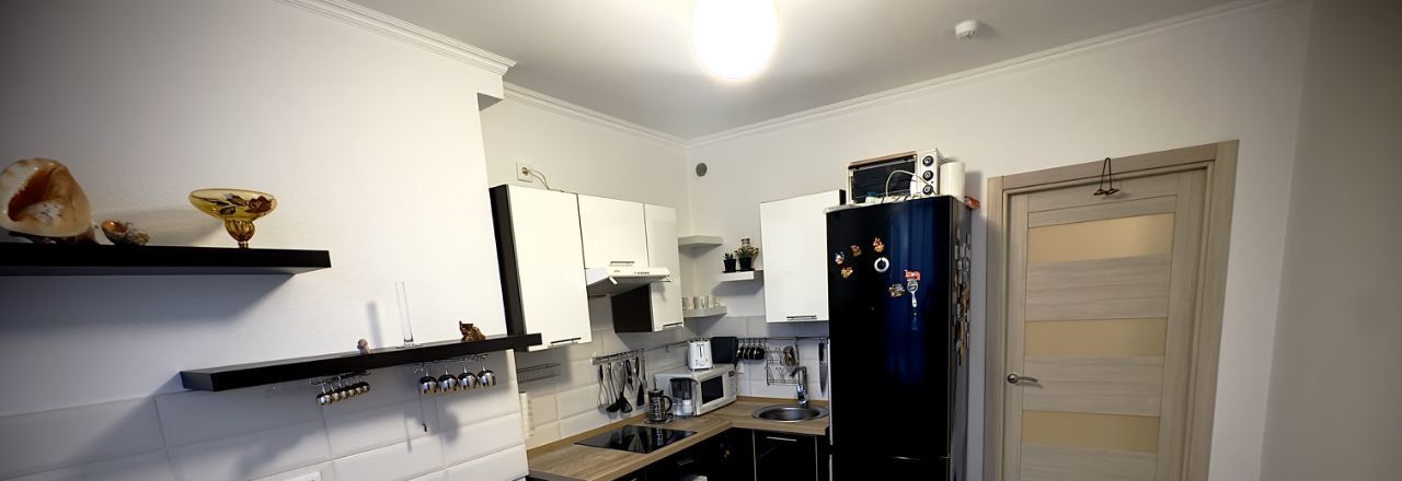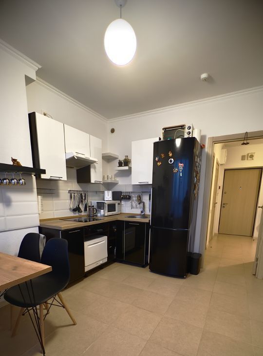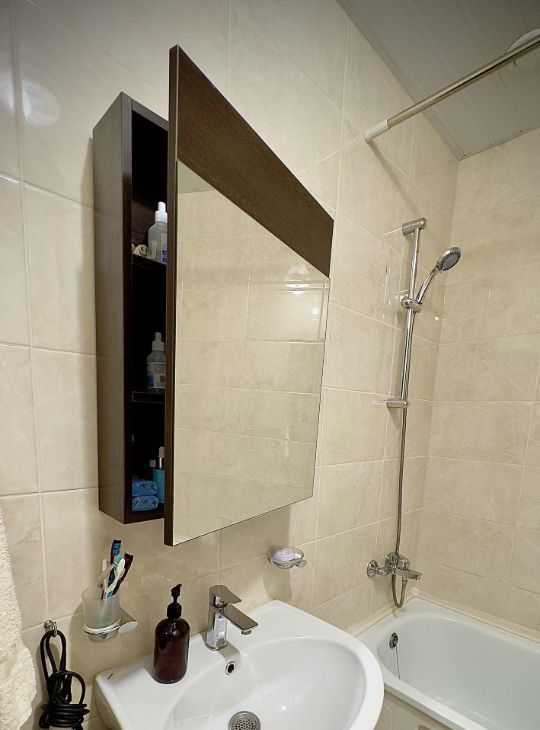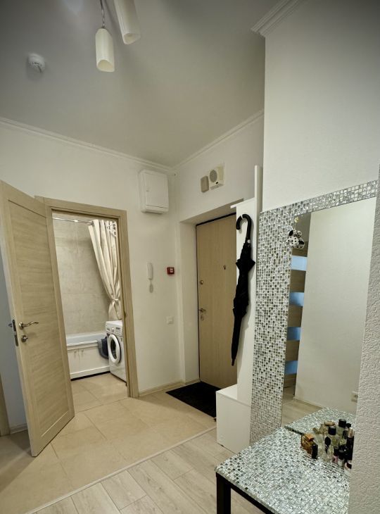 В квартире сделан косметический ремонт. На кухне и в комнате есть вся необходимая мебель, а также комплект современной техники: холодильник, посудомоечная и стиральная машины. Санузел раздельный, оборудован душевой кабиной. Дом оснащён мусоропроводом, интернет уже подключён.