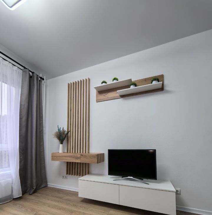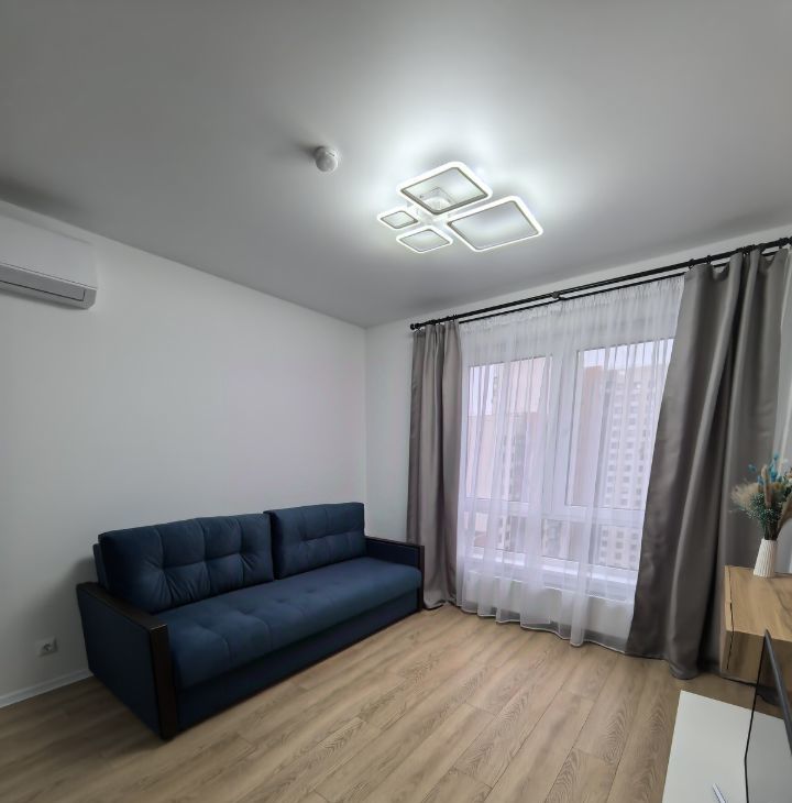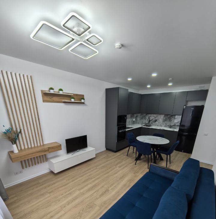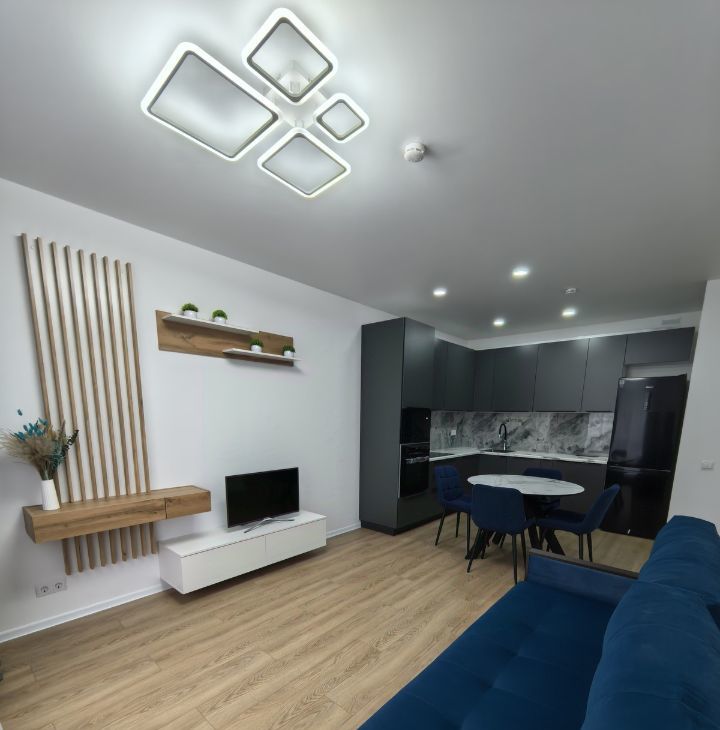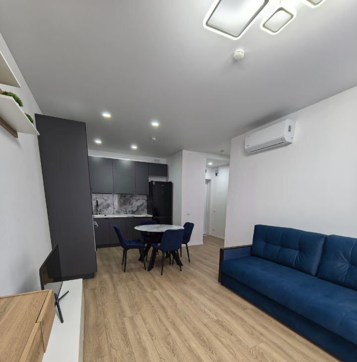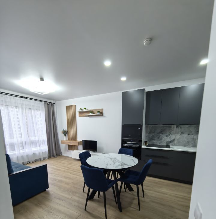 Продуманная планировка: просторная кухня-гостиная и отдельная уютная спальня. Интерьер выполнен в современном стиле с акцентом на комфорт и функциональность.