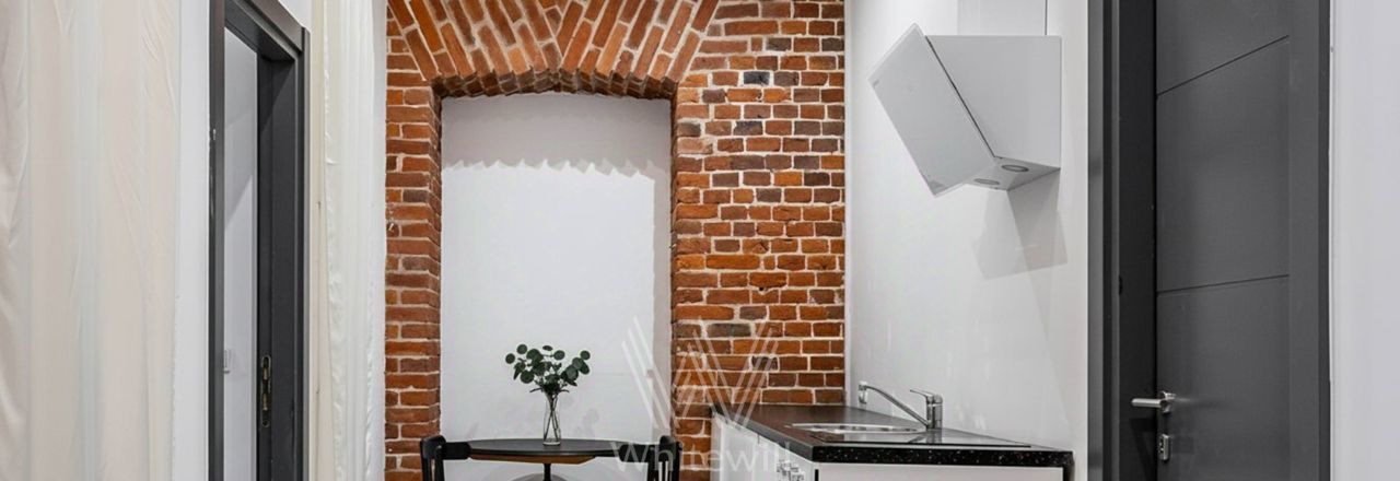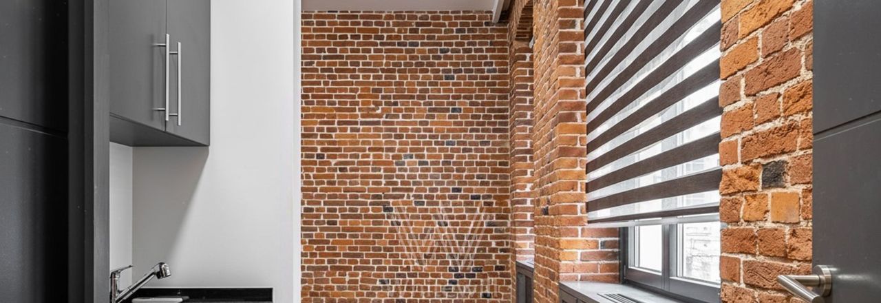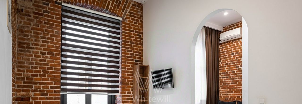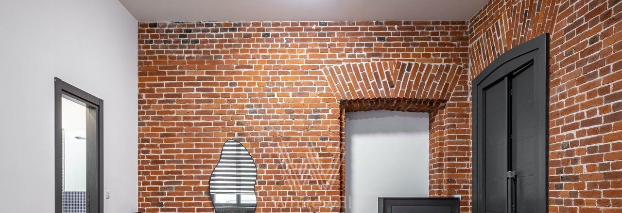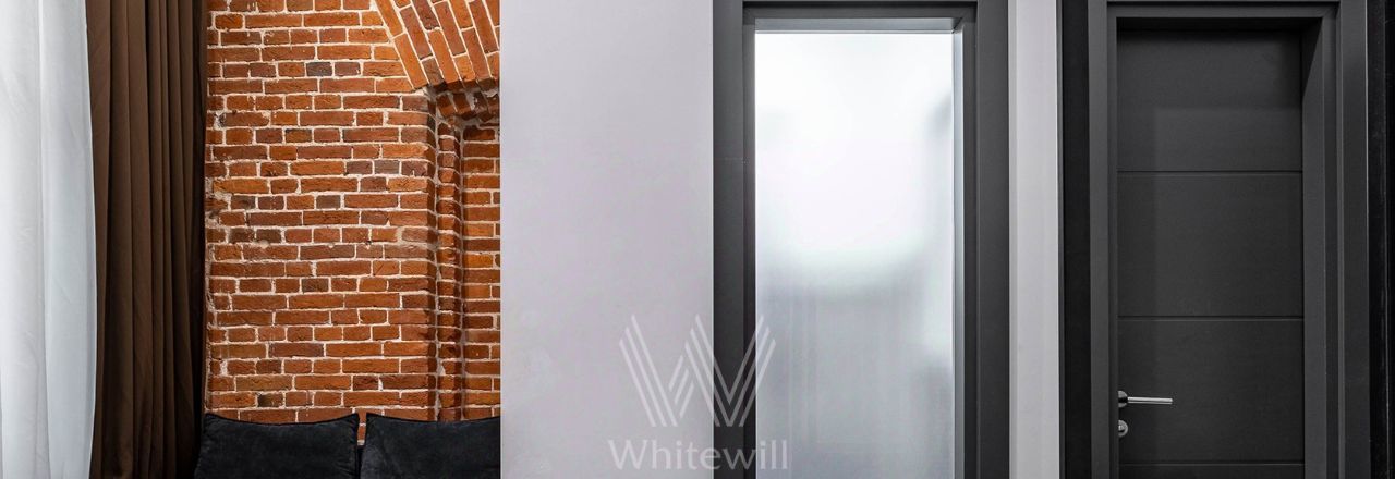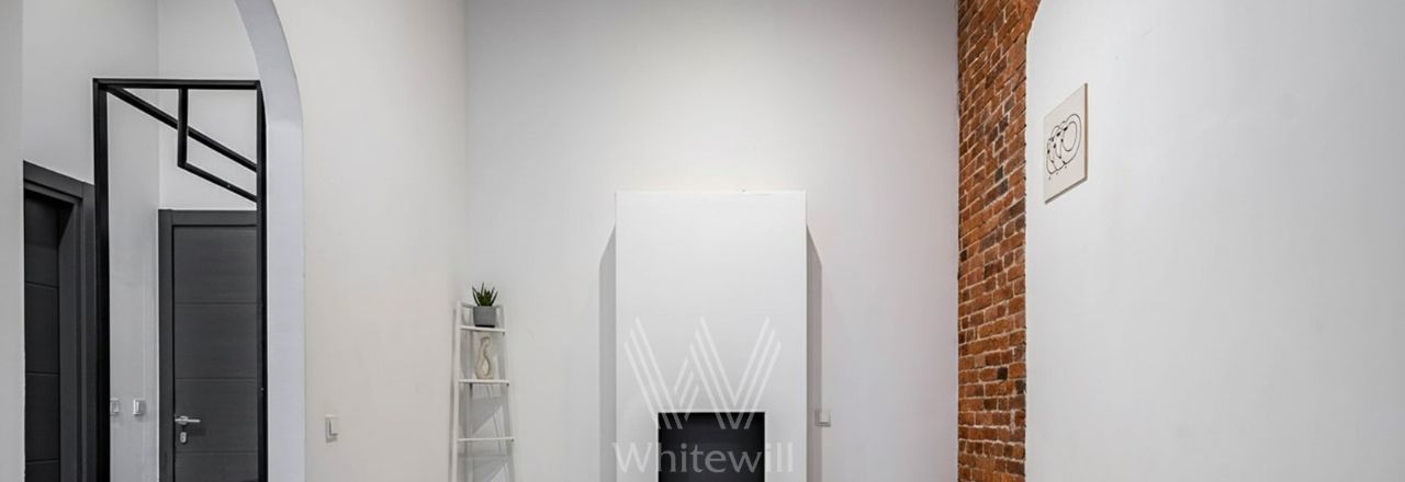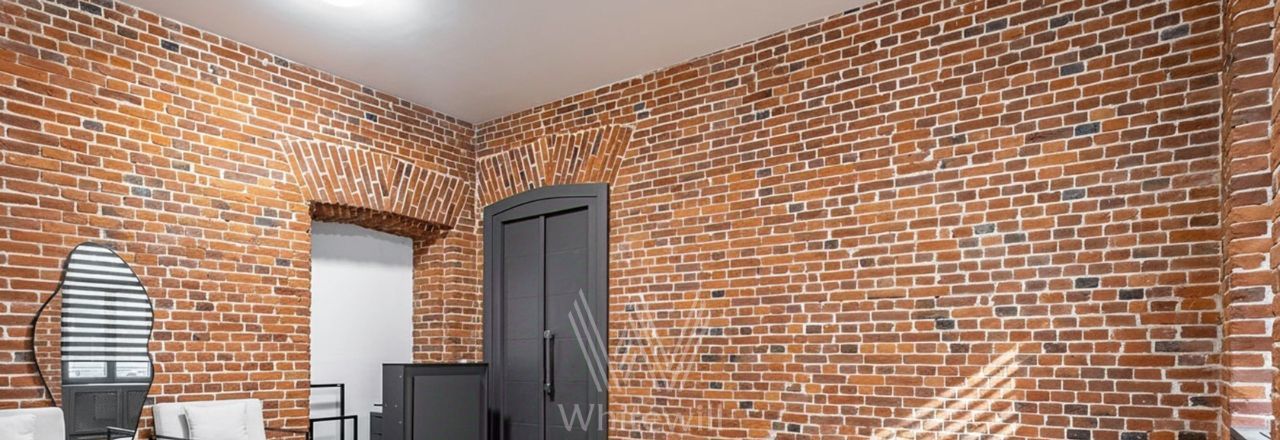 Отделка выполнена в стиле "лофт" с использованием красного кирпича. Благодаря большим окнам и потолкам высотой 4 метра пространство наполнено светом. Спланирована просторная зона openspace, кухни, комната с собственным санузлом, гостевой санузел, постирочная, прихожая.