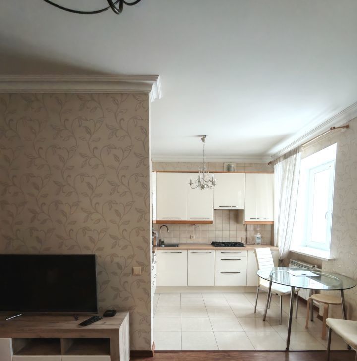 Гостиная соеденена с кухней. Большая удобная ванная комната 8 метров.