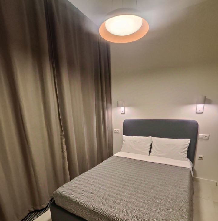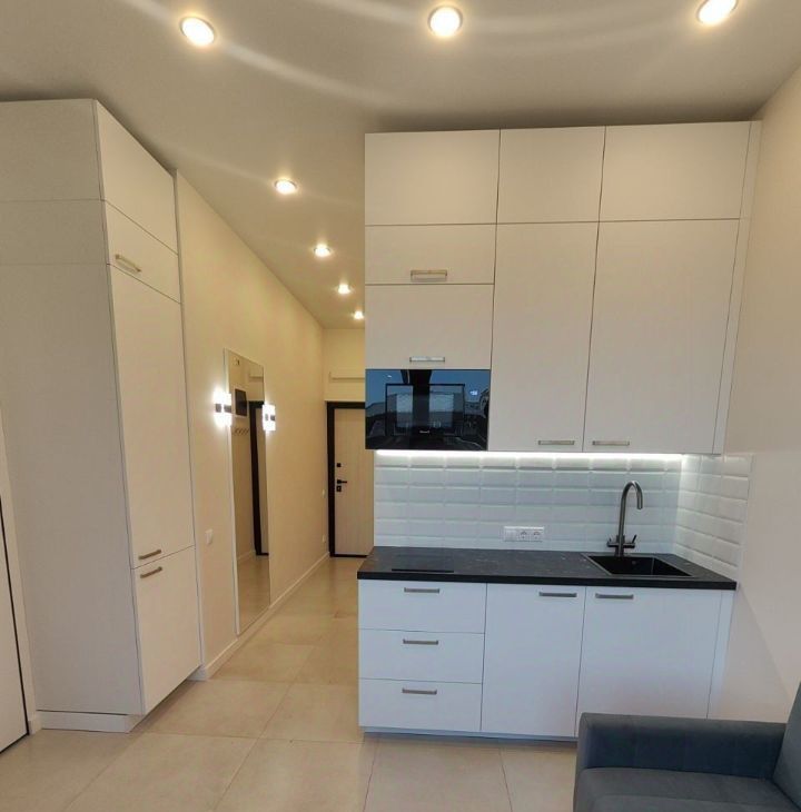 Кухня совмещена с гостиной, установлен удобный гарнитур и вся необходимая техника (холодильник, плита, вытяжка, стиральная машина). Спальня изолированная, просторная. Санузел смежный, есть ванная, гардеробная и балкон.
