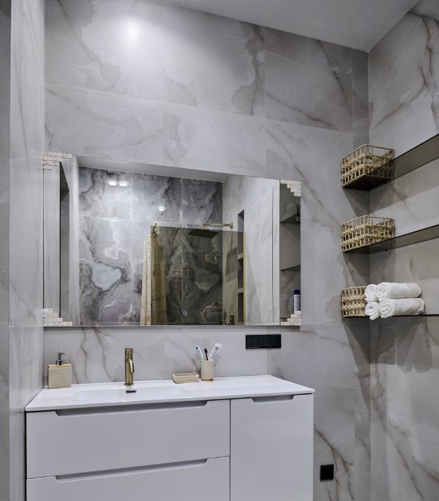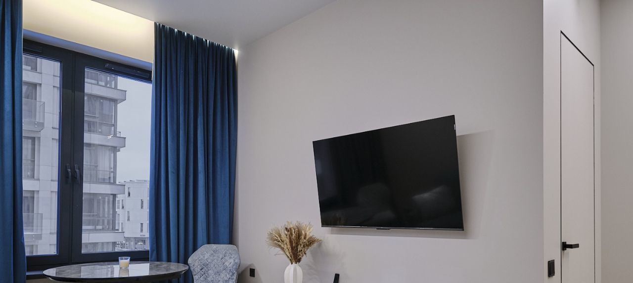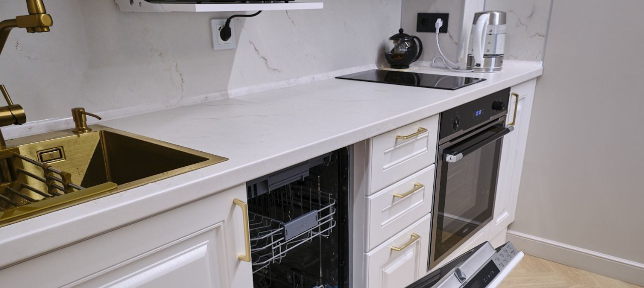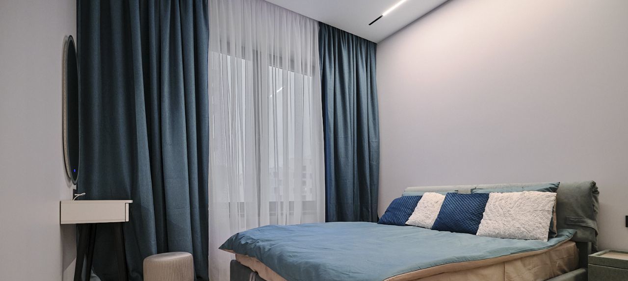 Квартира выполнена в дизайнерском стиле и полностью готова к проживанию. В просторной кухне площадью 15 кв. м есть вся необходимая мебель и техника: холодильник, посудомоечная машина и кондиционер. В жилой зоне также предусмотрена мебель, отвечающая всем требованиям комфорта. Ванная комната оборудована душевой кабиной и стиральной машиной. Для вашего удобства в квартире проведен интернет и установлен телевизор.
