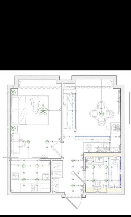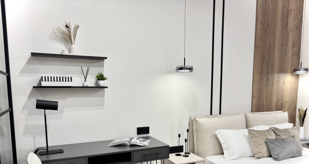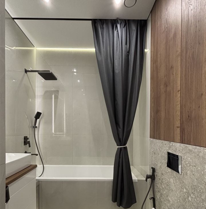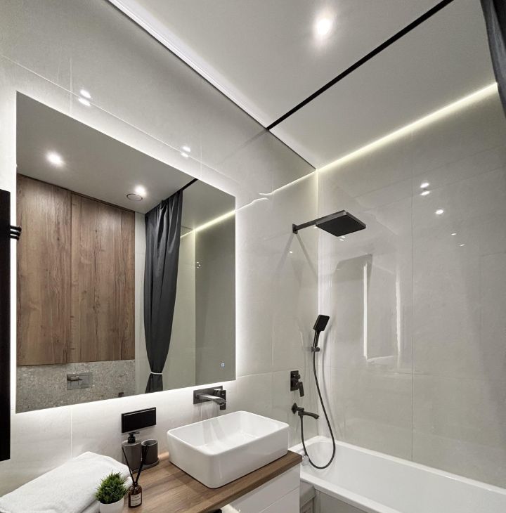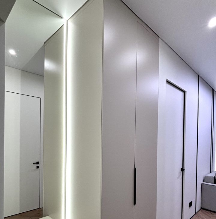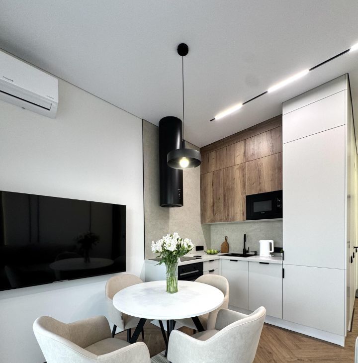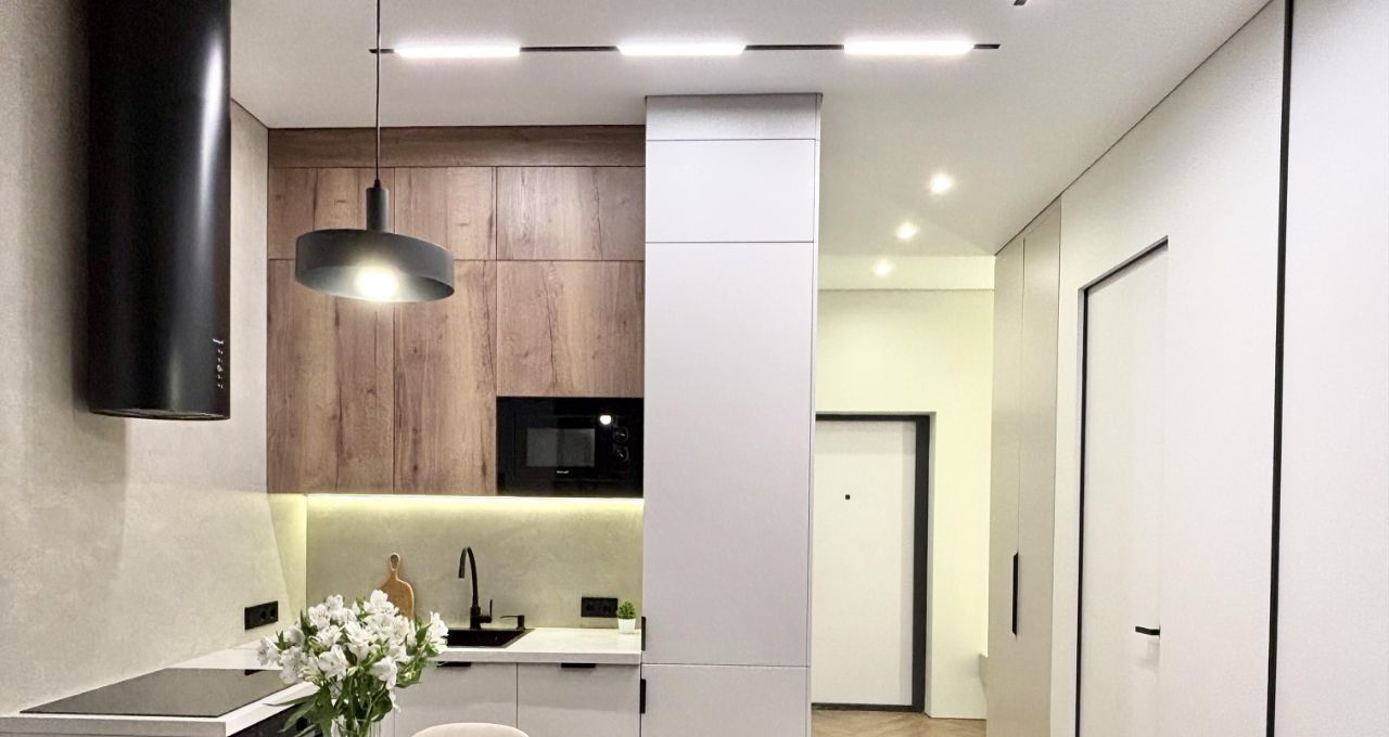 • вся необходимая бытовая техника: встроенный холодильник, варочная поверхность + вытяжка, посудомоечная машина, микроволновая печь и духовой шкаф