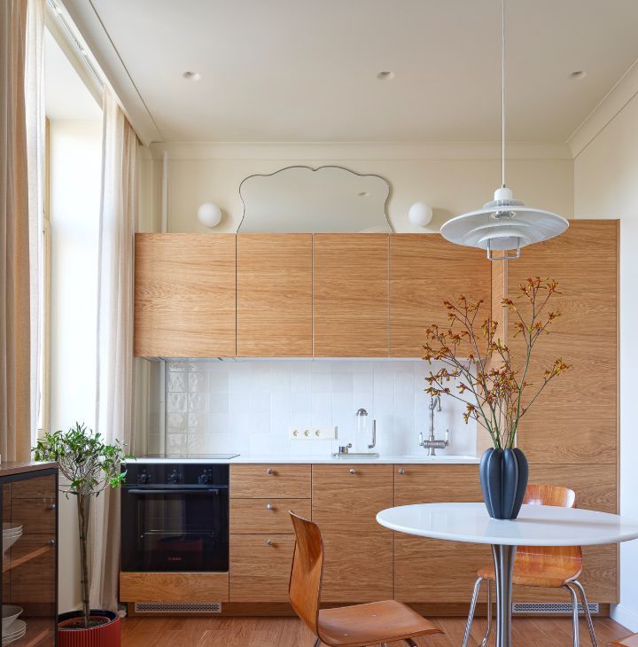 Кухня: натуральный шпон, каменная столешница, техника Liebherr и Bosch, идеальная эргономика и много мест хранения.