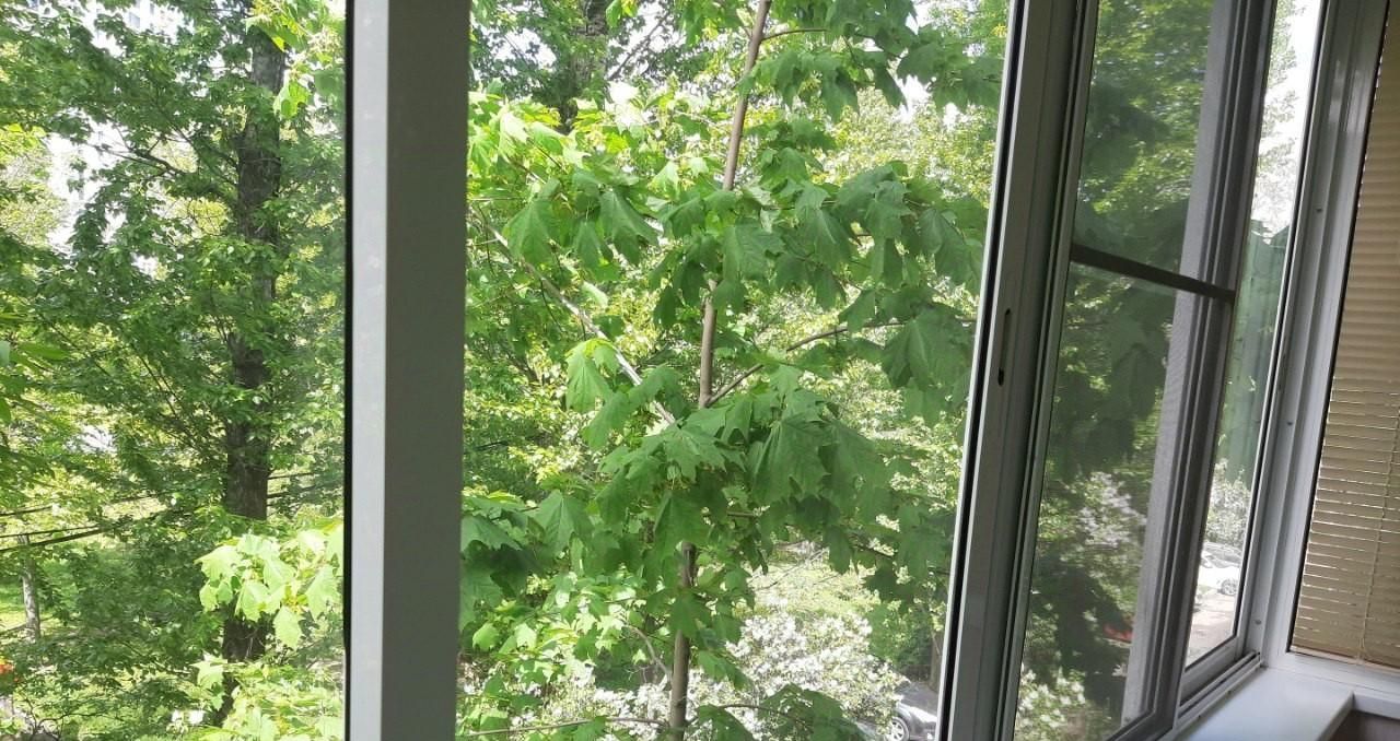 -тихий двор, окна на деревья;
