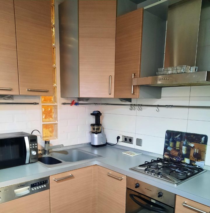 Кухня со встроенным гарнитуром с подсветкой и качественной бытовой техникой, включая, посудомоечную машину, микроволновку, блендер, кофемашину, пароварку, соковыжималку и многое другое.