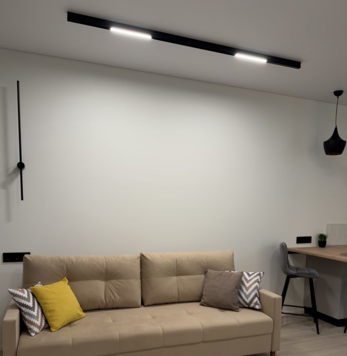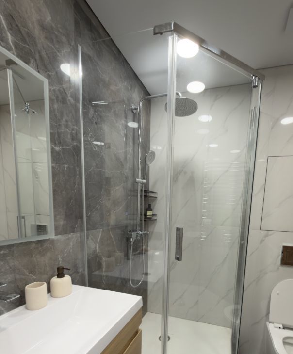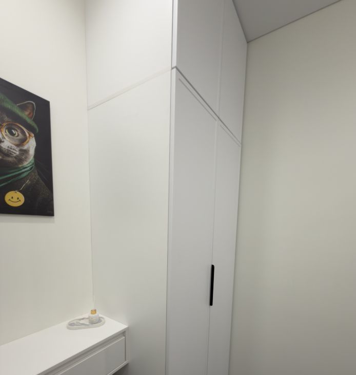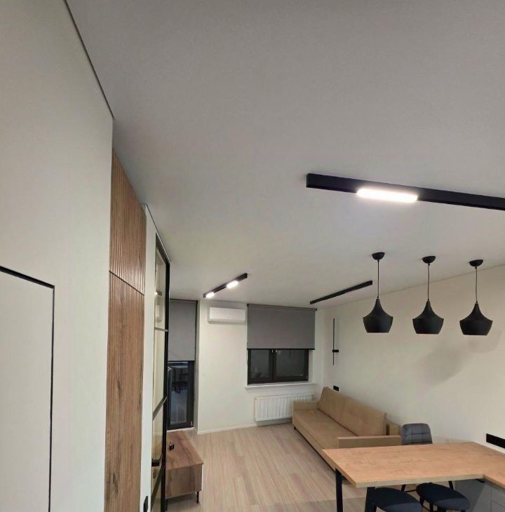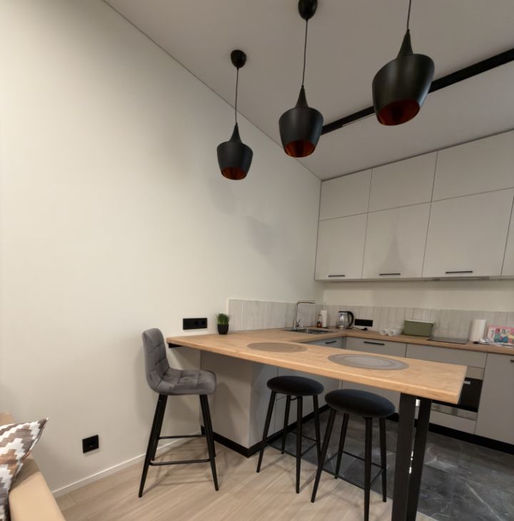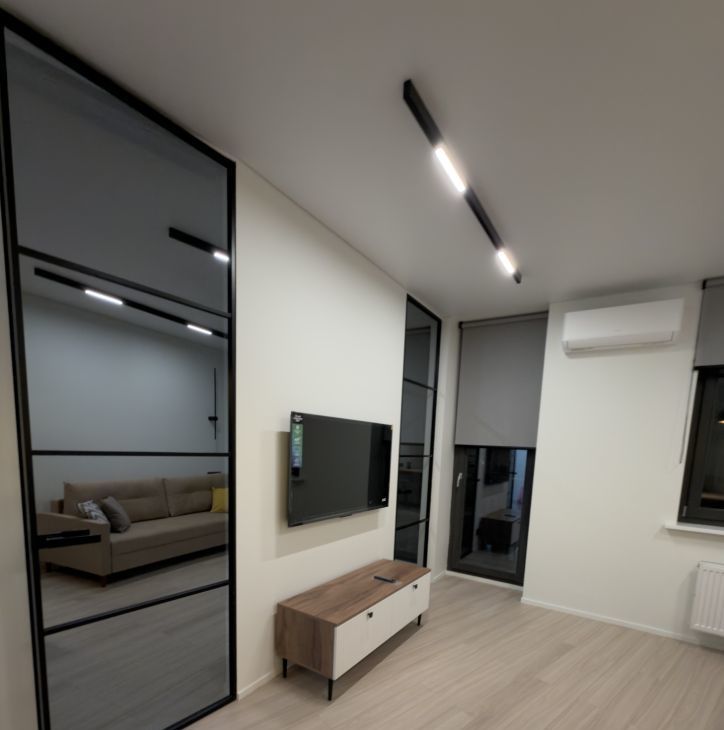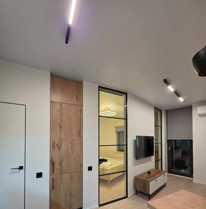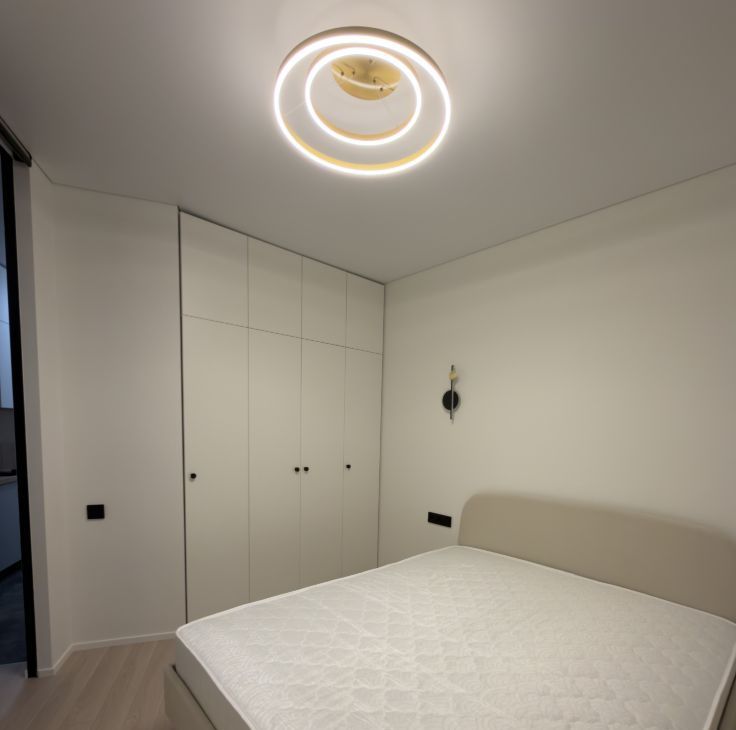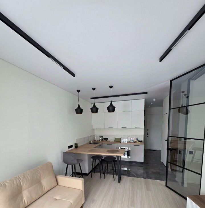 Кухня просторная совмещенная с гостиной, оборудована всем необходимым для комфортного проживания. В квартире предусмотрены шкафы и гардеробная для хранения вещей. Спальную комнату отделяют две стеклянные двери, добавляющая воздуха и пространства.
