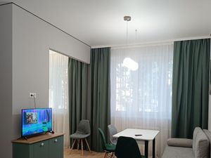 Кухня-гостиная и отдельная комната спальня с широкой кроватью с ортопедическим матрасом. Высокие потолки в 3 метра создают ощущение пространства и света. Окна выходят во двор, что гарантирует тишину и спокойствие.