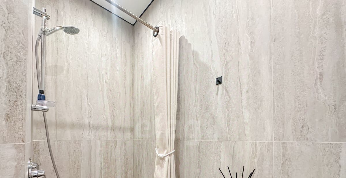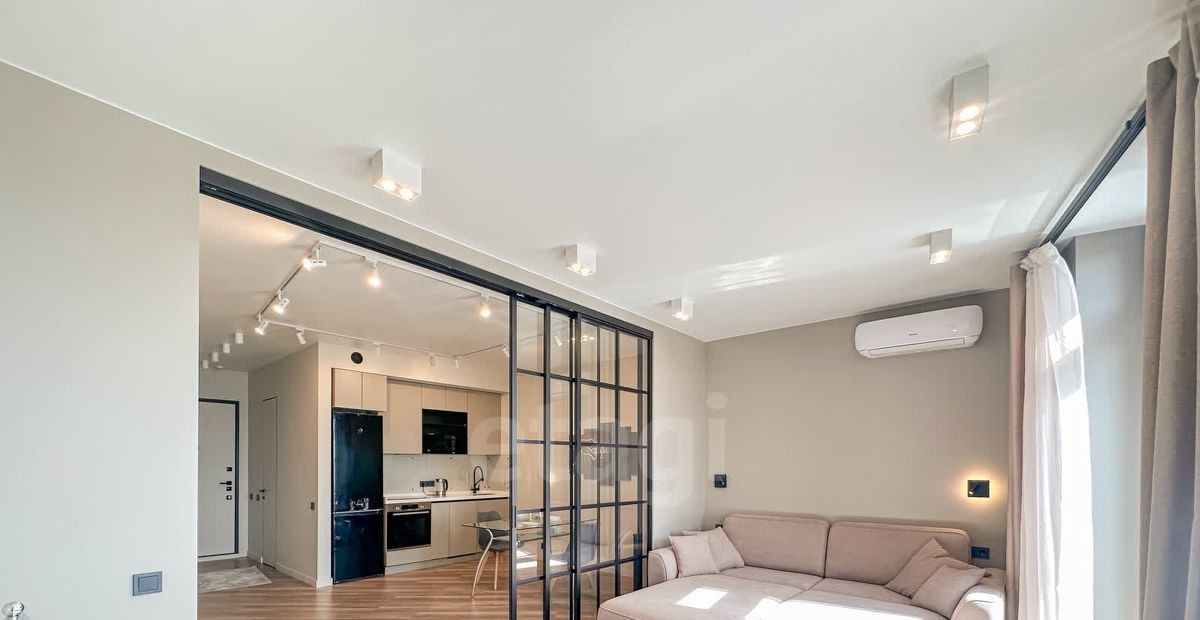 Внутреннее пространство включает просторную кухню-гостиную, уютную спальню и совмещенный санузел. Все элементы корпусной мебели выполнены под заказ: стильный шкаф-купе, функциональный кухонный гарнитур с встроенной посудомоечной машиной, холодильником и плитой. Для вашего удобства установлен кондиционер, который создаст комфортную атмосферу в любое время года.