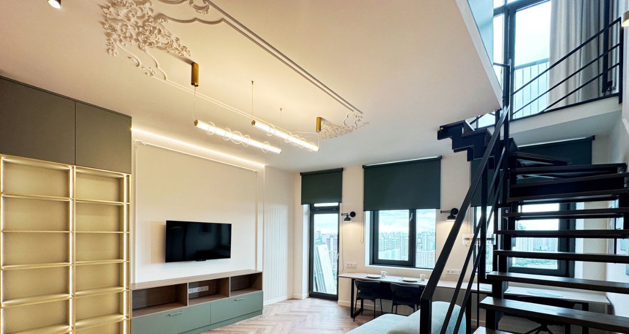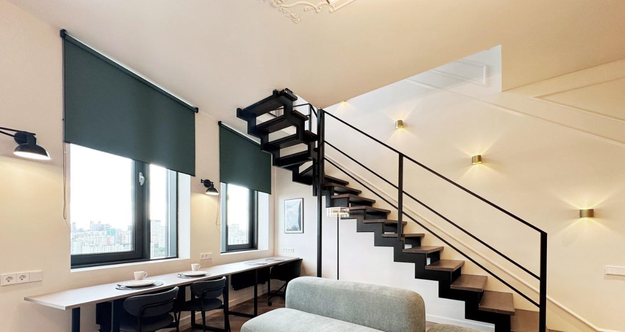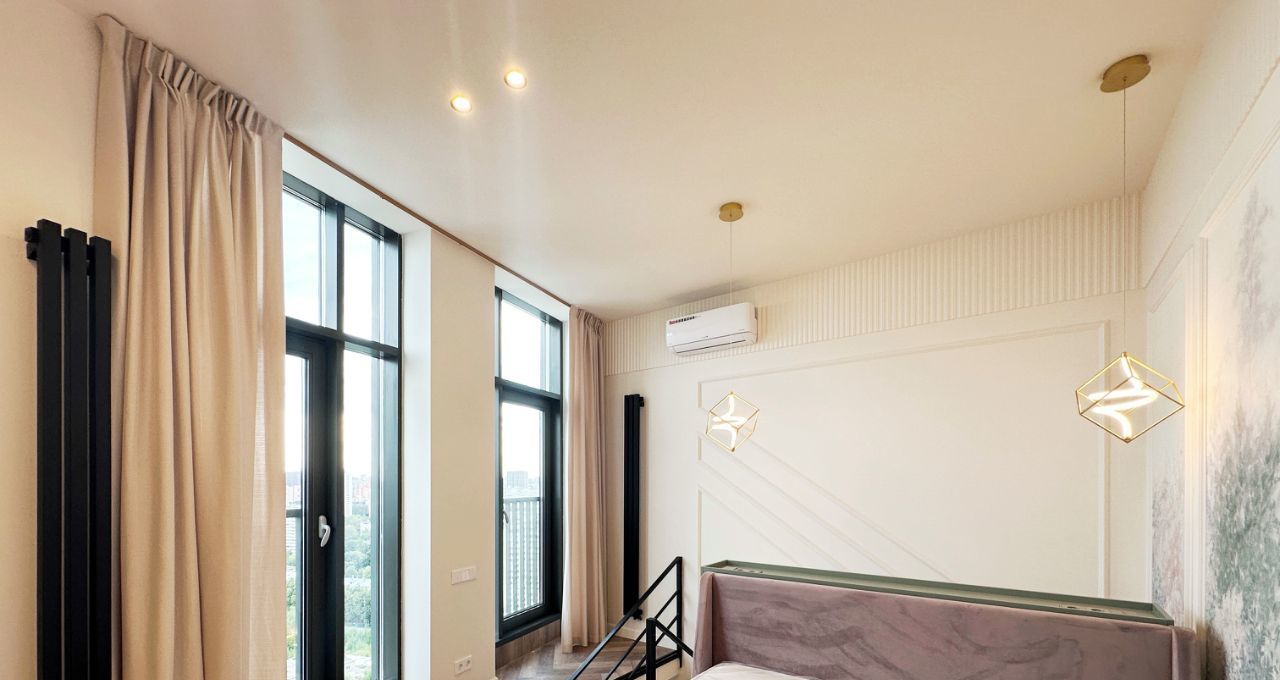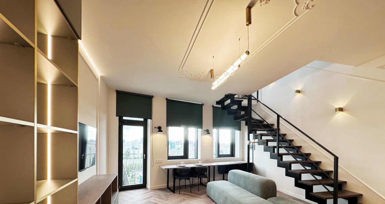 На первом уровне просторная гостиная, объединенная с кухонной зоной, обеденное пространство и рабочее место расположены перед окнами с красивым панорамным видом на город и закат. Кухня оборудована современным гарнитуром со встроенной техникой, есть посудомоечная машина. В прихожей вместительные шкафы, в санузле теплый пол и водонагреватель на время летних отключений горячей воды. Установлен кондиционер, большой телевизор со смарт-ТВ, интернет уже подключен. На втором уровне приватная спальня с дополнительным большим шкафом. Высота потолков более 3 метров.