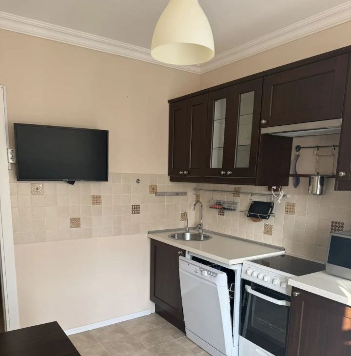На кухне и в комнате установлена мебель, а также имеется вся необходимая техника: кондиционер, холодильник, посудомоечная машина, телевизор и стиральная машина.