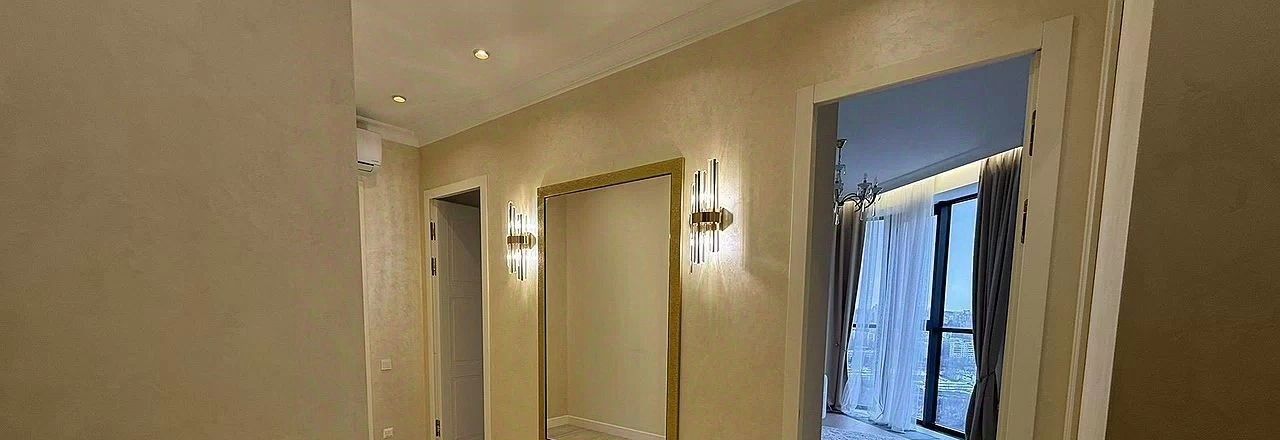 Вся бытовая техника и мебель новая. Все необходимое для комфортной жизни в квартире имеется. Гардеробная , просторные комнаты и студия со всей бытовой техникой и мебелью.