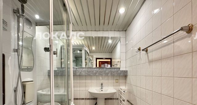 В ванне душевая кабина в комбинации с ванной, стиральная машина, электрический полотенцесушитель, огромные зеркала.