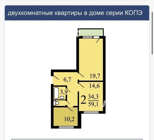 Общая 59,1 м², Жилая 34,6 (19,8 и 14,8) м², Кухня 10,2 м², Этаж 3 из 22.