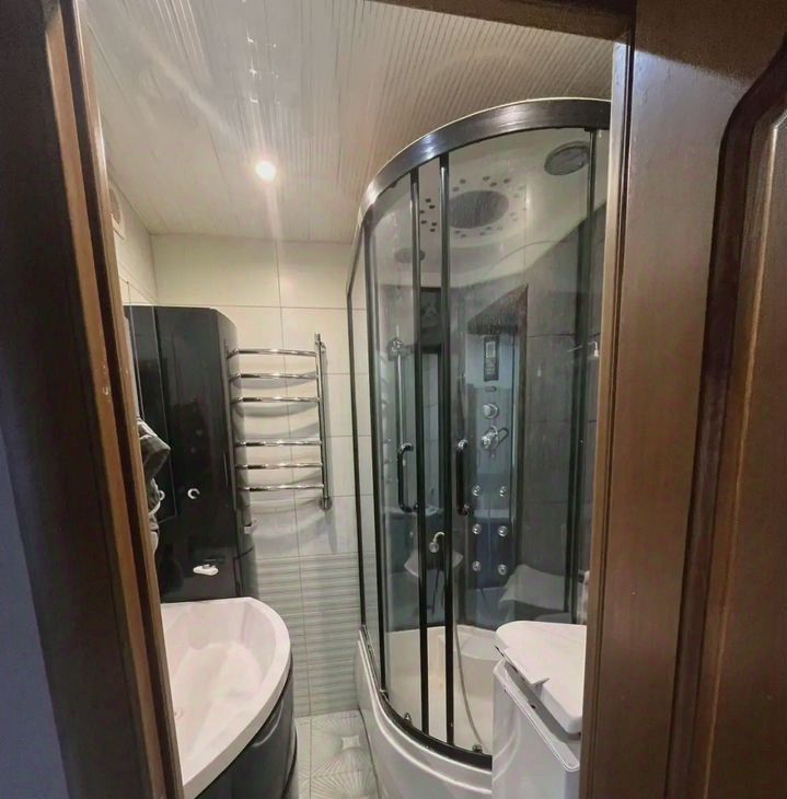 Санузел раздельный, оснащён современной душевой кабиной. В прихожей предусмотрены удобные полки для верхней одежды.