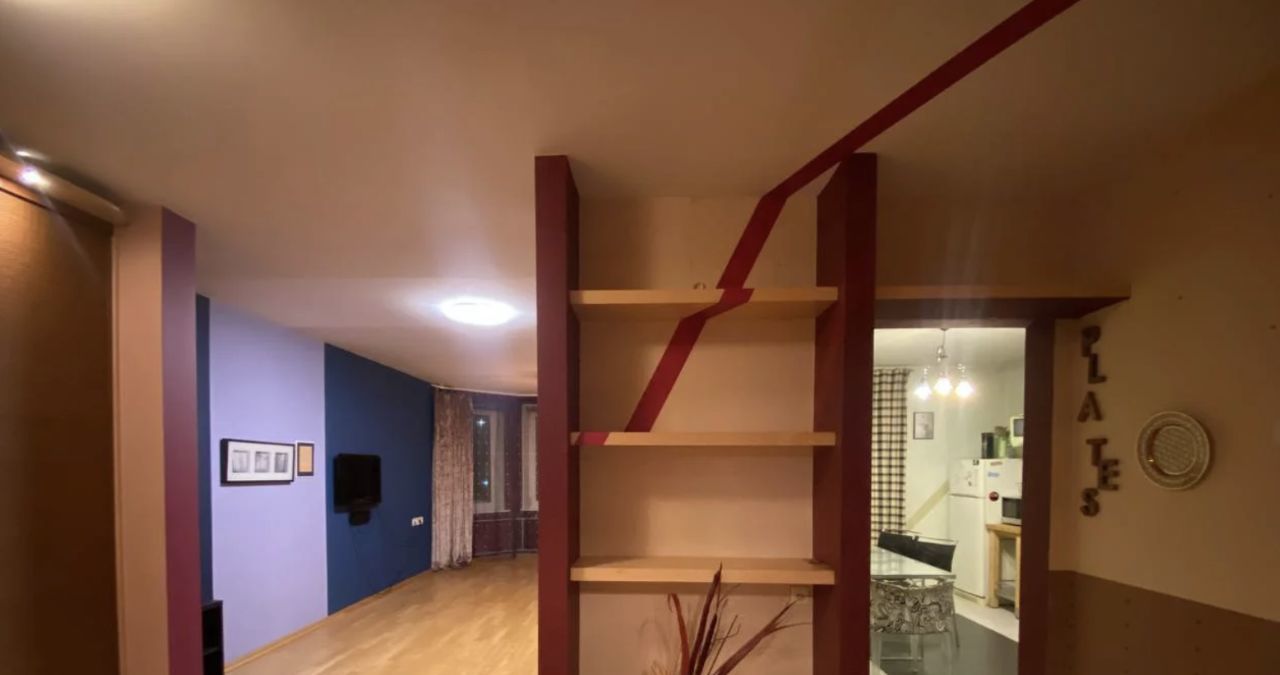 В спальне установлена удобная кровать, есть прикроватные тумбы, стеллаж для книг, вместительные шкафы и комод. Гостиная разделена на зону отдыха и рабочее пространство. Отдельная светлая кухня, ванная комната и прихожая со шкафом и большим зеркалом создают ощущение порядка и уюта.