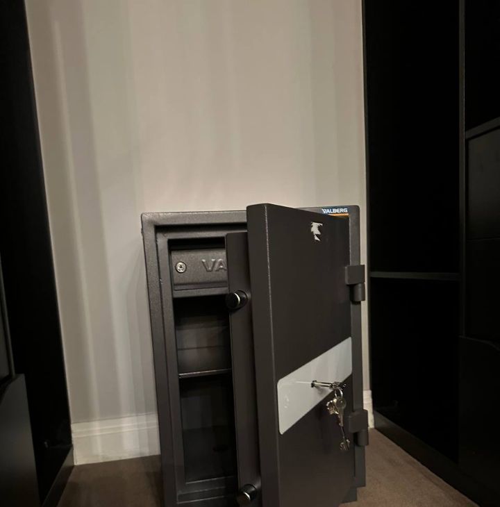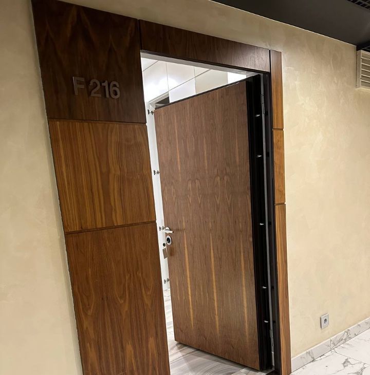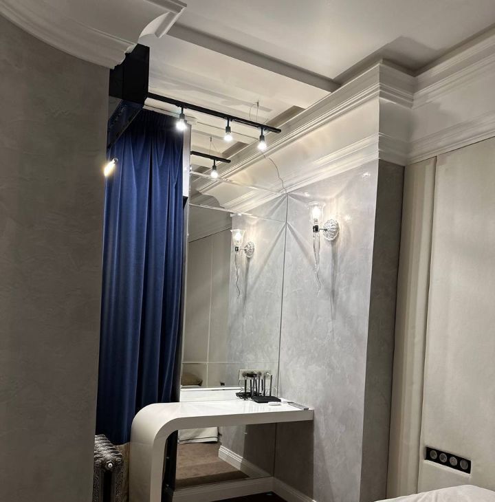 Спальня с собственной гардеробной, в которой установлен вместительный сейф. В районе большой двуспальной кровати с высоким матрасом и мягким изголовьем сделана дополнительная шумоизоляция, поэтому в спальне очень тихо.