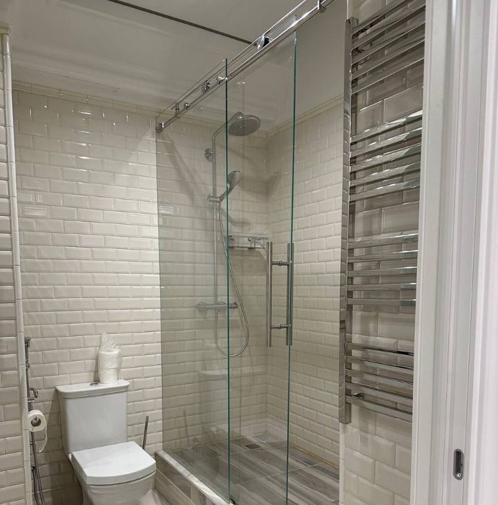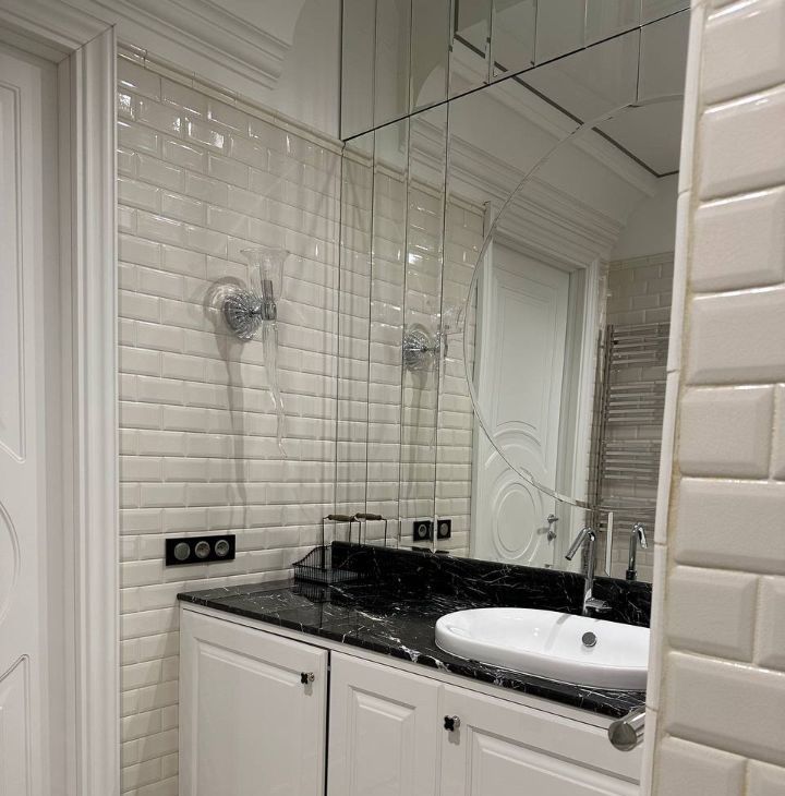 С/у укомплектован стирально-сушильной машиной с огромной душевой и дизайнерским зеркальным панно над раковиной.