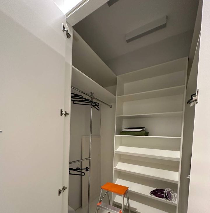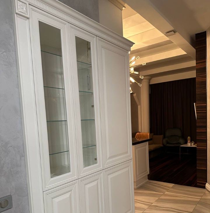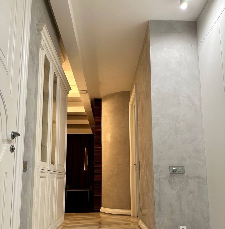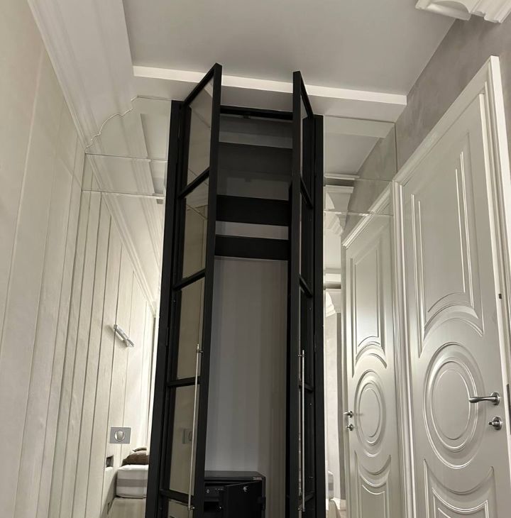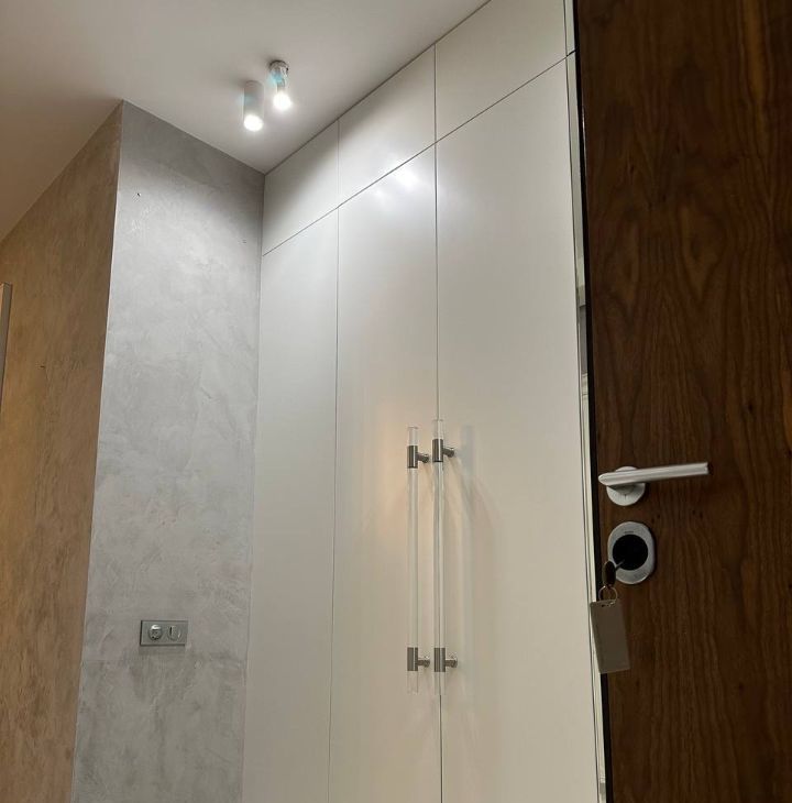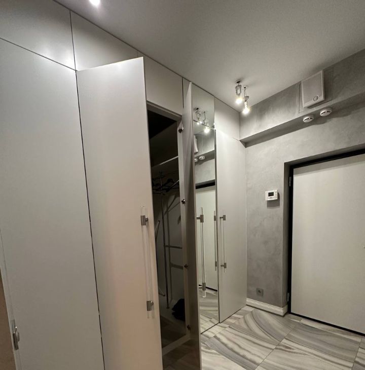 Просторная прихожая с вместительной гардеробной и зеркалом в пол.