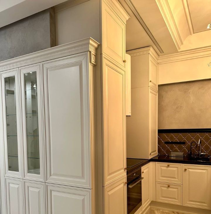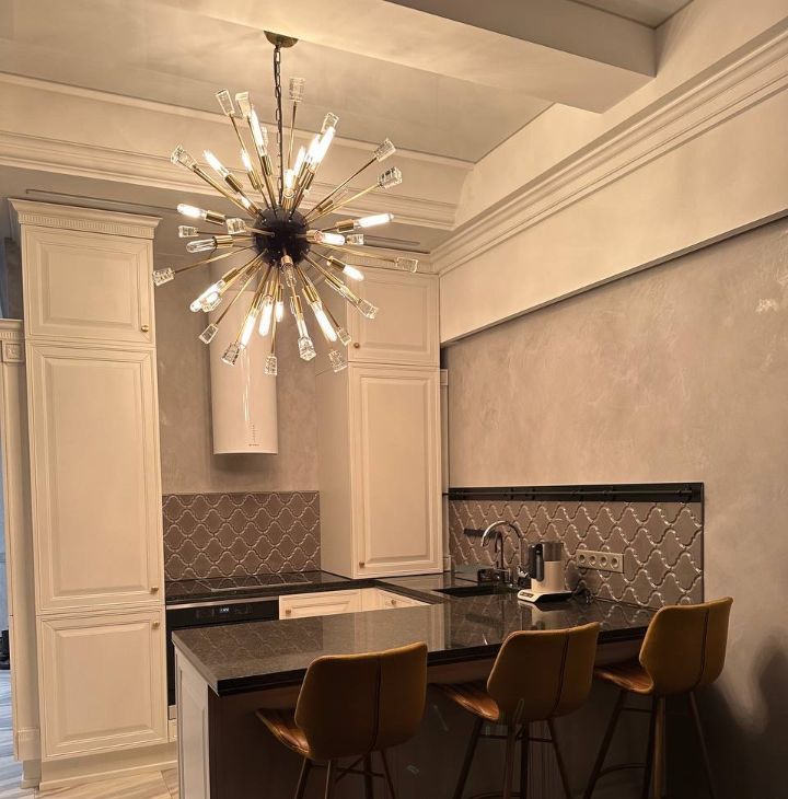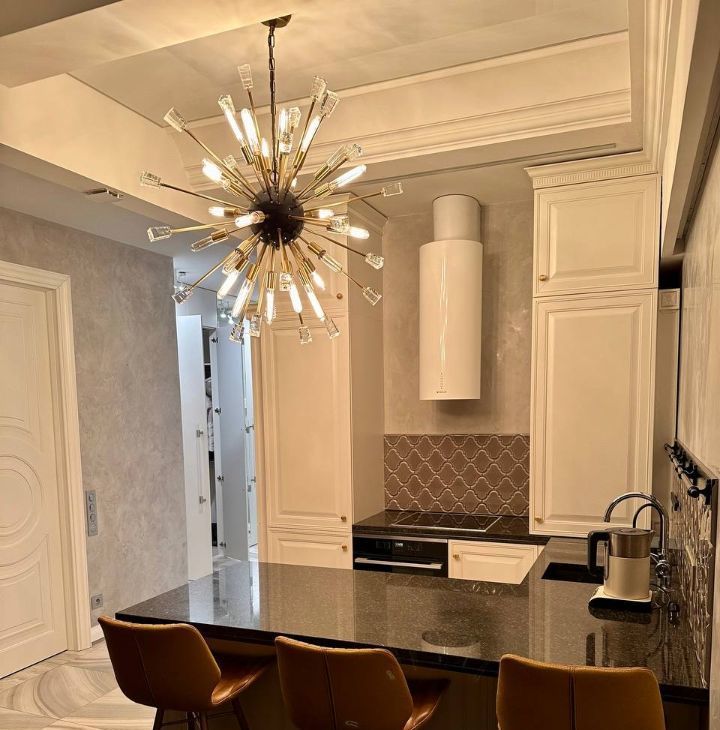 Кухня с широким столом-островом и стильными кожаными барными стульями укомплектована премиальной техникой (Liebherr холодильник, Miele посудомоечная машина, Miele варочная панель, Miele духовой шкаф, вытяжка, фильтр для воды).