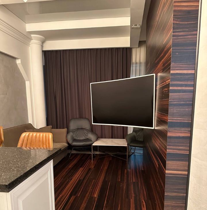 Зона гостиной включает в себя удобный диван, 2 кресла, журнальный столик, телевизор на поворотном кронштейне (почти на 180 градусов), который удобно смотреть с любого ракурса.