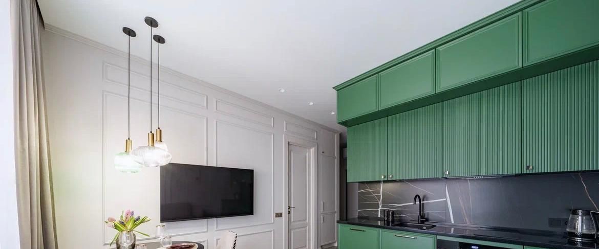 Кухня-гостиная - диван, ТВ, кухонный гарнитур с бытовой техникой (варочная панель, духовой шкаф с свч, посудомоечная машина, холодильник).