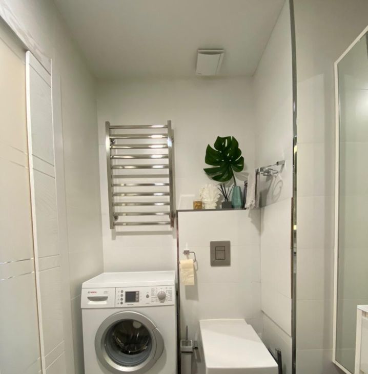 Ванная комната: большая ванна с тропическим душем, сантехника Villeroy & Boch, смесители Hansgrohe, стиральная машина, шкаф для хранения