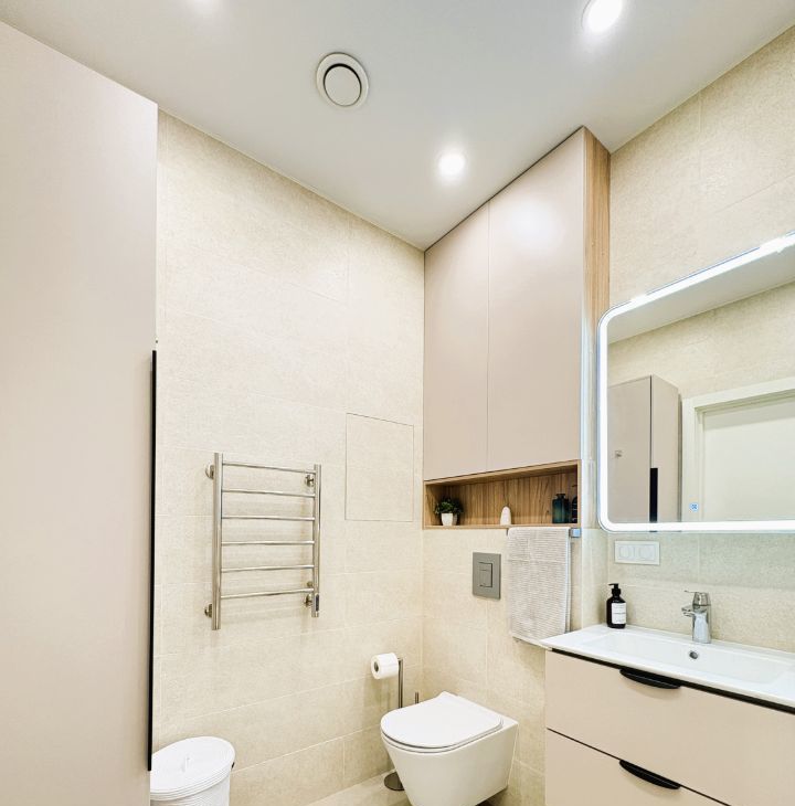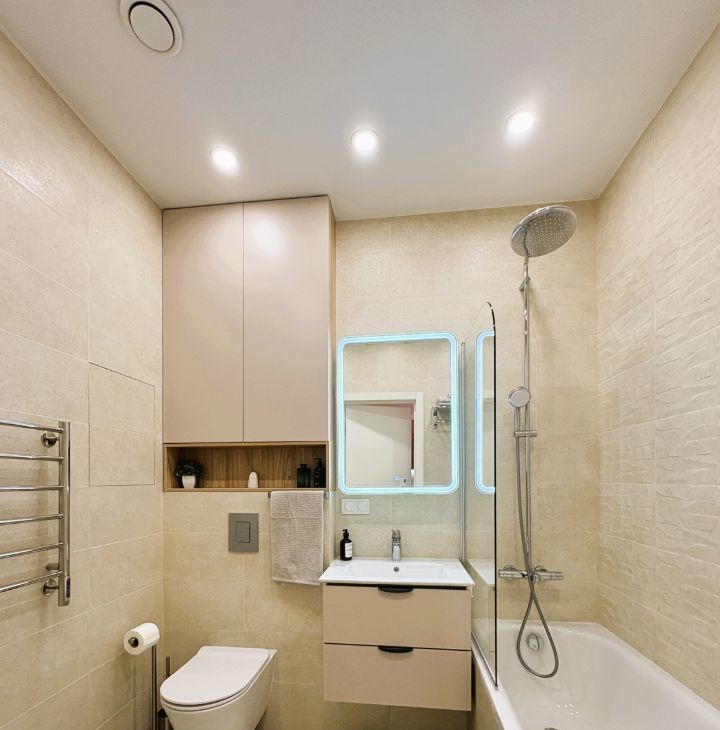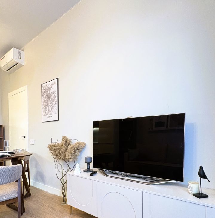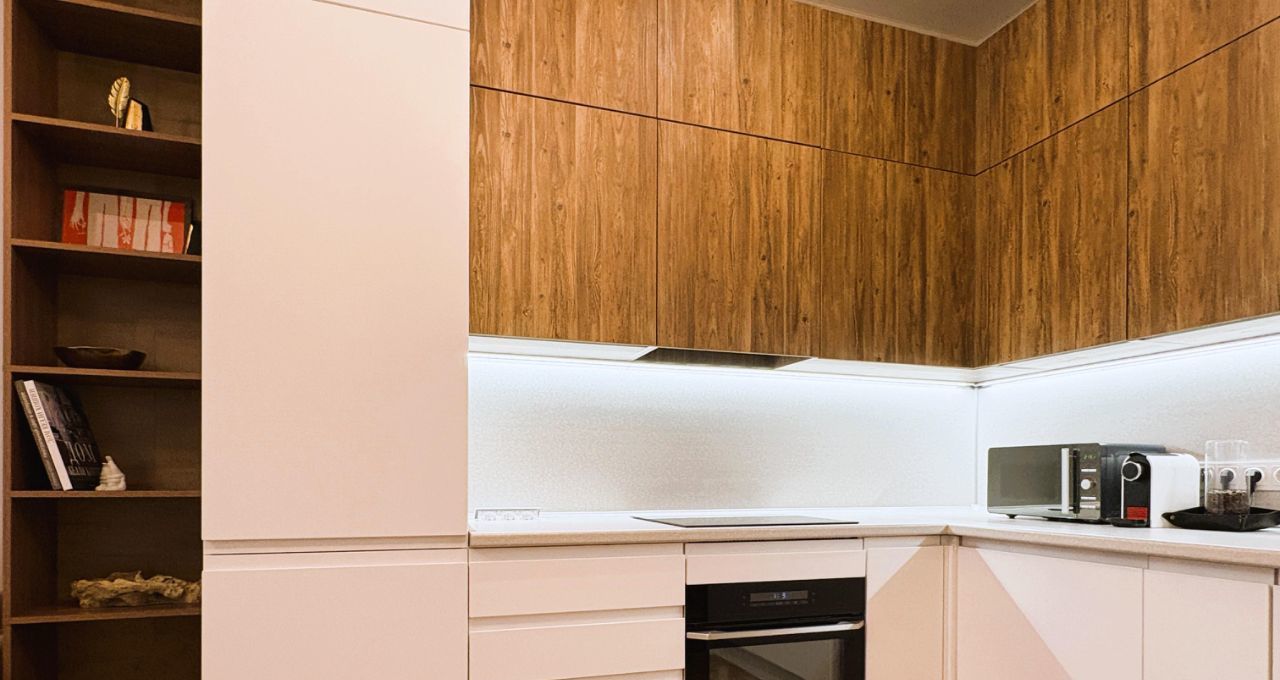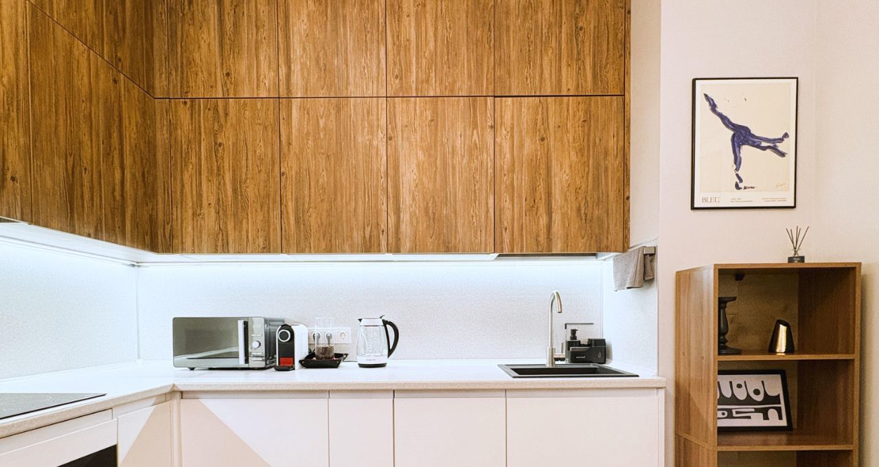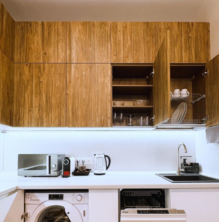 Вся необходимая бытовая техника: холодильник, индукционная варочная поверхность, духовка, вытяжка, микроволновка, посудомоечная машина, капсульная кофемашина, чайник, стиральная машина, пылесос, утюг, кондиционер.