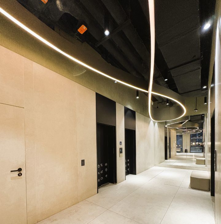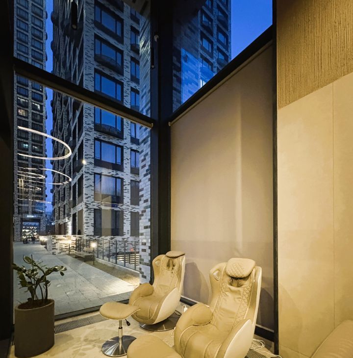Великолепное гранд-лобби со стойкой ресепшен, уютной лаунж-зоной, мягкими диванами, живыми растениями и изысканным освещением. Главная фишка — это настоящий камин и массажные кресла.