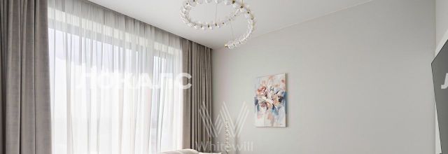Видовые апартаменты с 1-й спальней общей площадью 50 м² в комплексе бизнес-класса "Новоданиловская, 8". Апартаменты расположены на 13-м этаже в корпусе 1. Выполнен новый дизайнерский ремонт в современном стиле в лаконичных светлых тонах, интерьер украшен картинами, подвесными люстрами, на полу в гостиной уложен ковер. Большие окна наполняют пространство естественным светом.