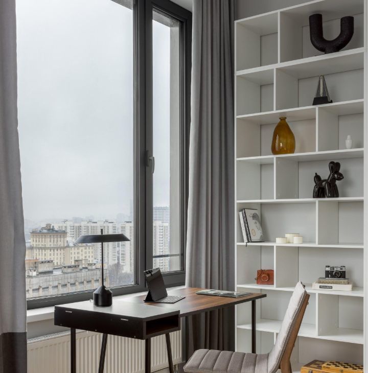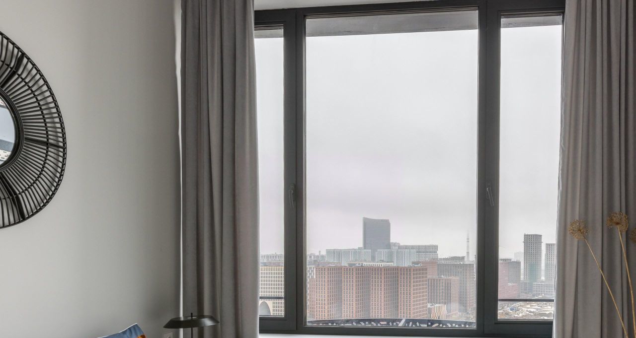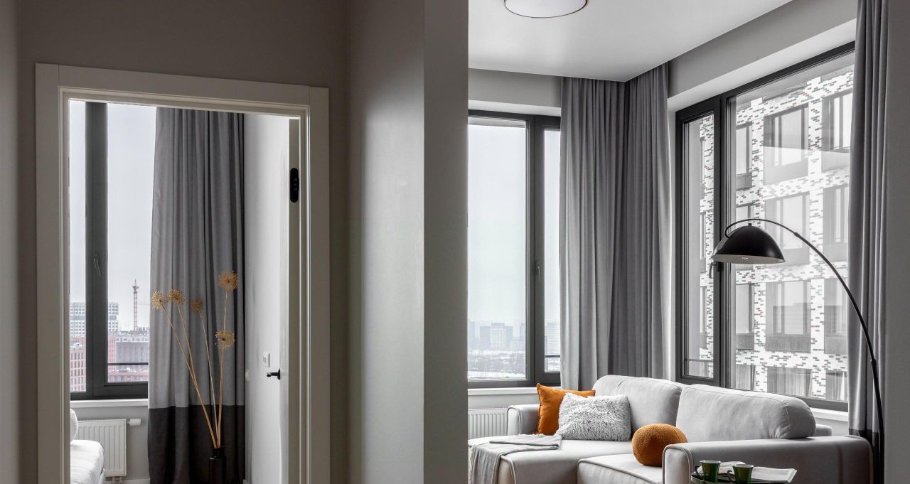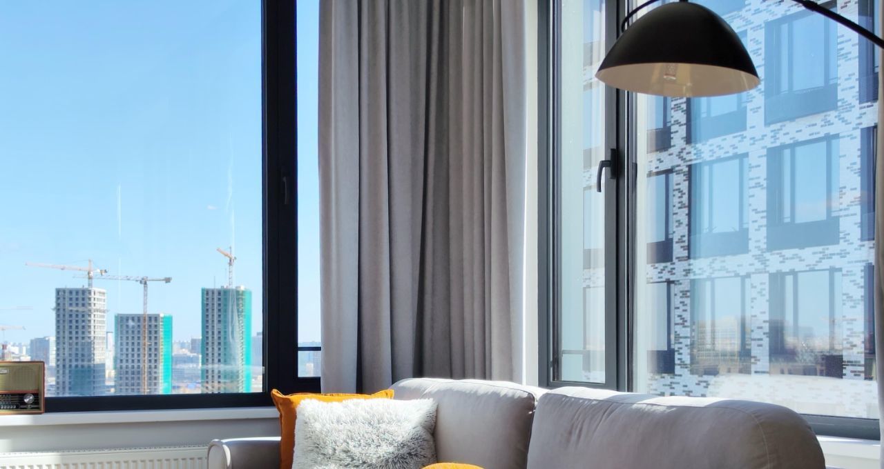 Окна в этой комнате находятся с двух сторон дивана, что дает возможность получать максимум света, а ночью любоваться на огни.