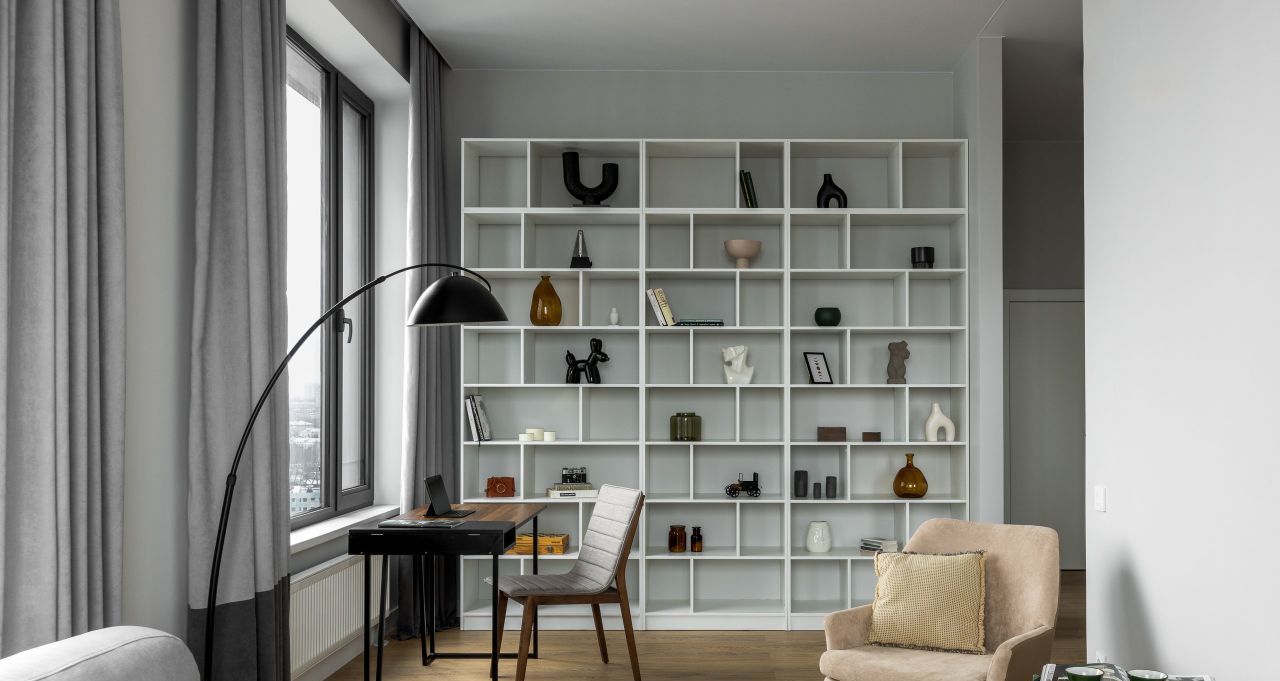 В гостиной есть рабочее место с широким столом и книжными полками. В другой части комнаты диван и телевизор.