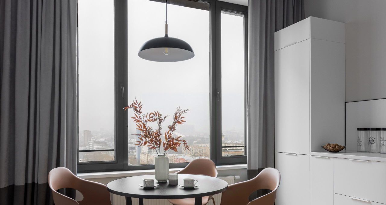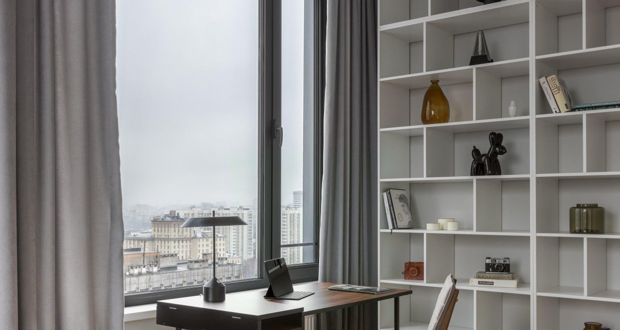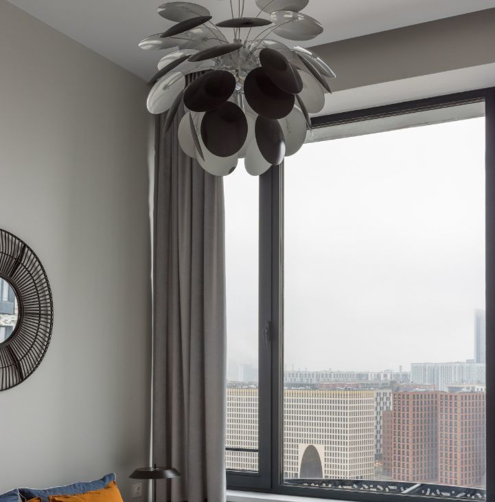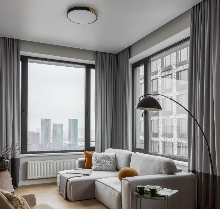 Окна в этой комнате находятся с двух сторон дивана, что дает возможность получать максимум света, а ночью любоваться на огни.