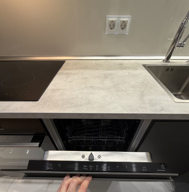 По технике есть: посудомойка и кондиционер, телевизор, духовой шкаф и микроволновка.