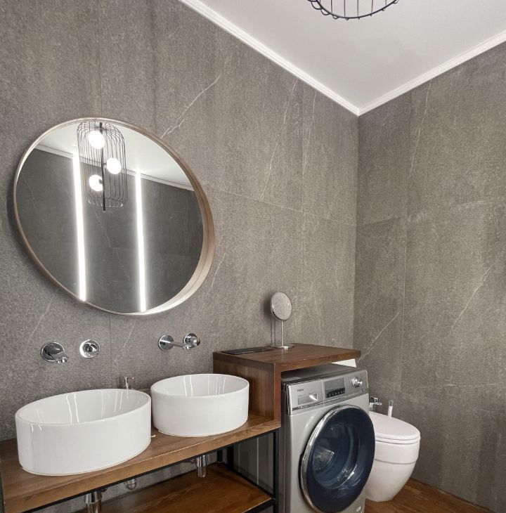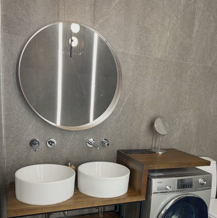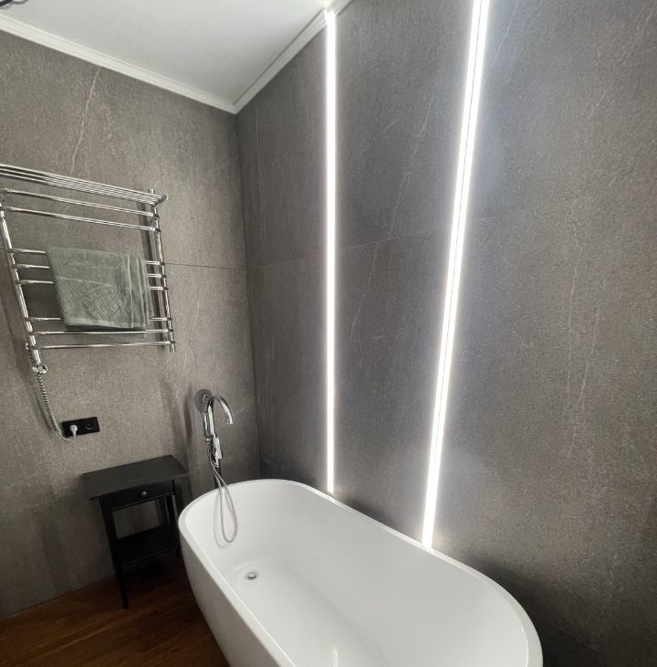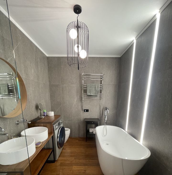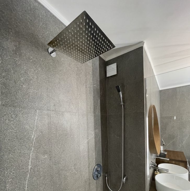 Стильный сан/узел с ванной, большой душевой зоной с тропическим душем. Поэтому вы всегда сможете выбрать, как провести время — расслабиться в ванне или принять тропический душ.