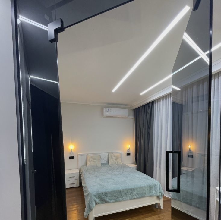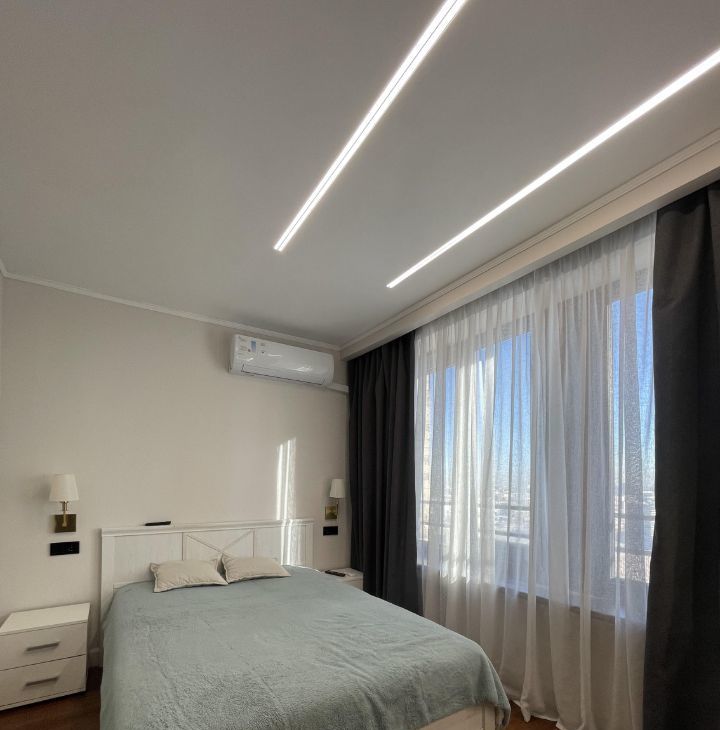 В уютной спальне кровать с ортопедическим матрасом для комфортного отдыха. Установлен кондиционер.