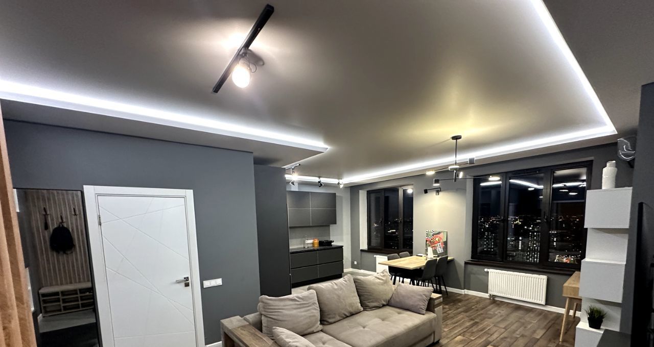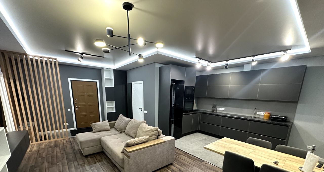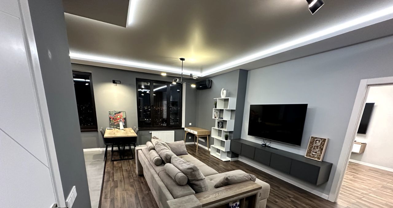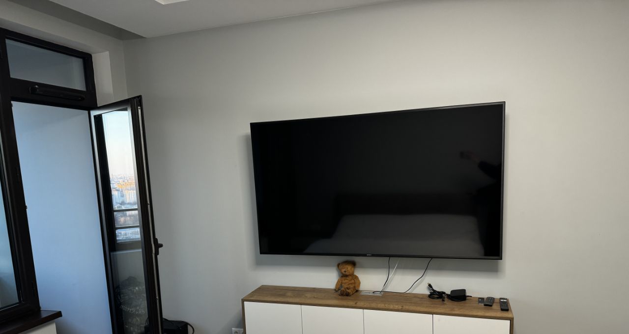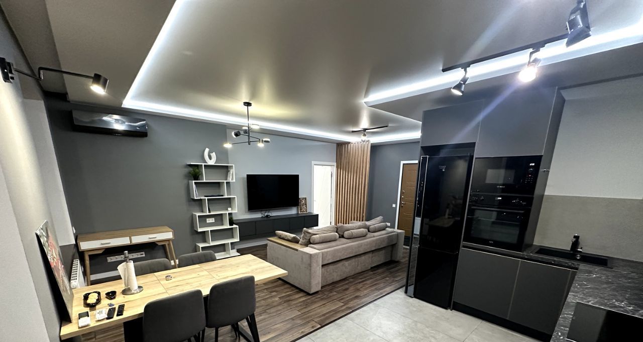 В кухне-гостиной установлен телевизор 4К, 65 дюймов, дорогой и удобный диван.