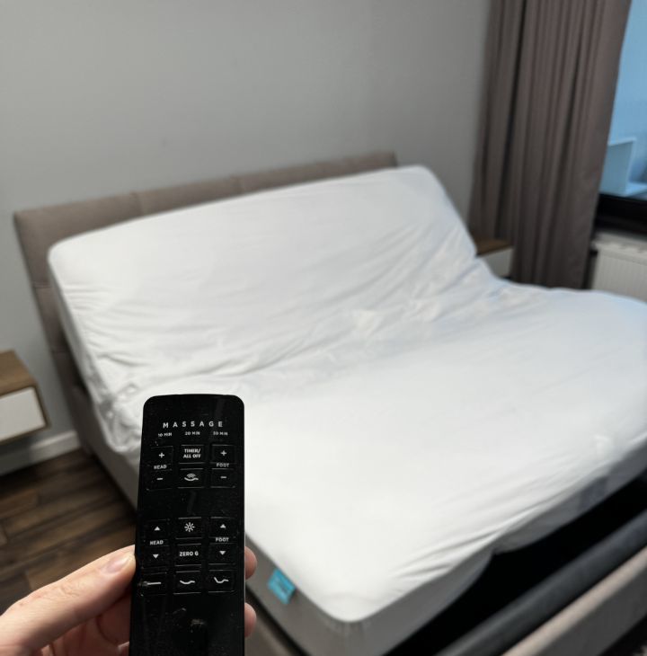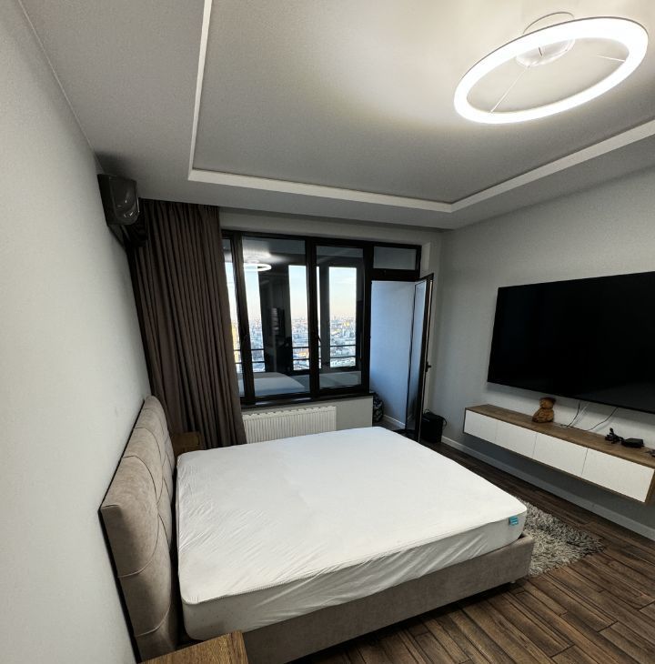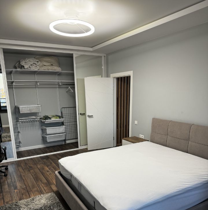В спальне установлена кровать с системой ergomotion от Аскона: Положение нулевой гравитации (Zero G), функция массажа, изменение положение подъема головы и ног с помощью пульта. Напротив установлен большой телевизор 4К 75 дюймов. Удобный огромный шкаф с гардеробной системой Lavrij.
