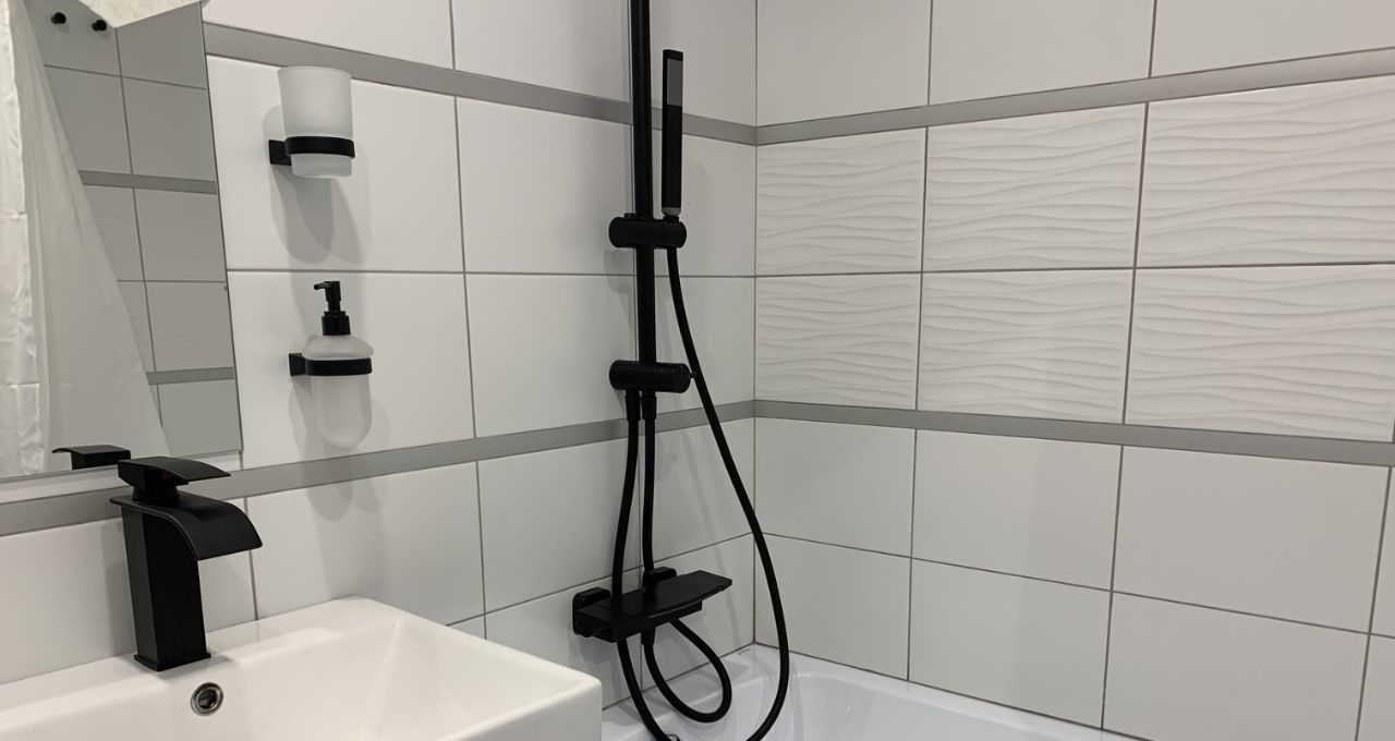 Просторный совмещенный с/у с французской ванной, подвесным черным унитазом, стиральной машиной автомат и сантехникой по последнему слову стиля!