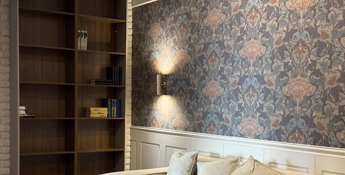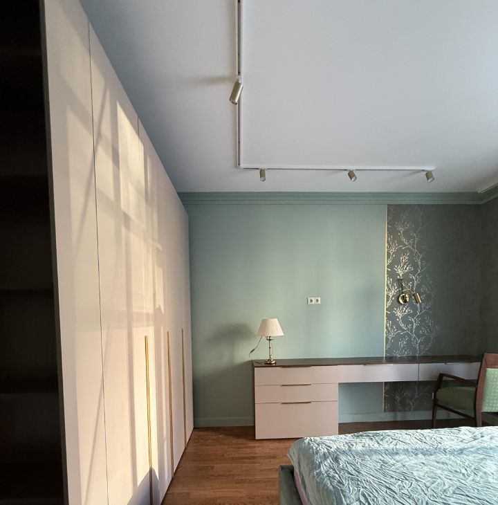 Мебель и интерьер выполнены в спокойных тонах в стиле неоклассики, что создает одновременно и уют, и удобство. Продумано очень много мест для хранения и комфорта.