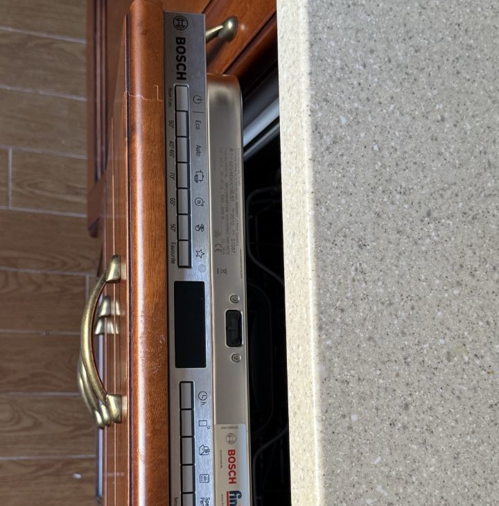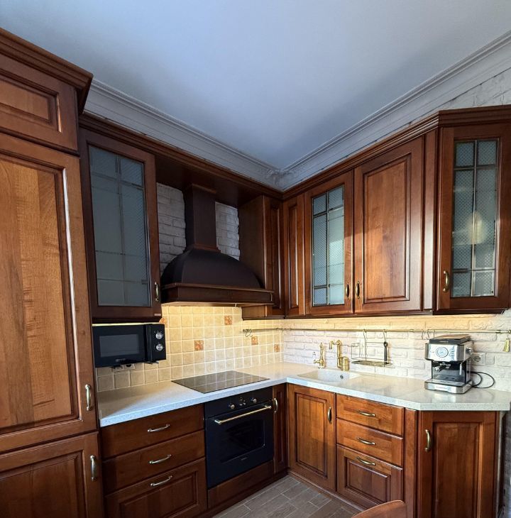 Кухня из натурального дерева Scavolini оборудована современной техникой, включая холодильник Miele, индукционную варочную поверхность, духовой шкаф Bosch и посудомоечную машину Bosch. Встроенные шкафы обеспечивают достаточное количество места для хранения.
