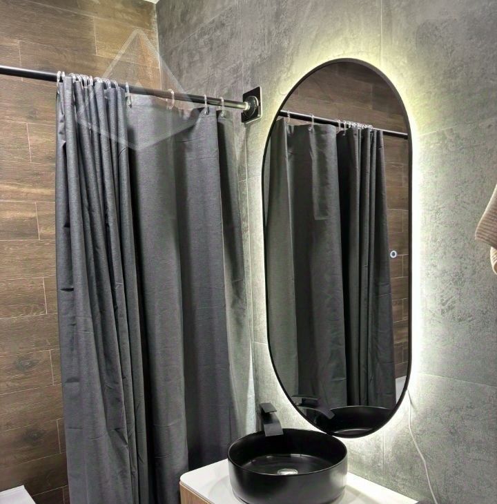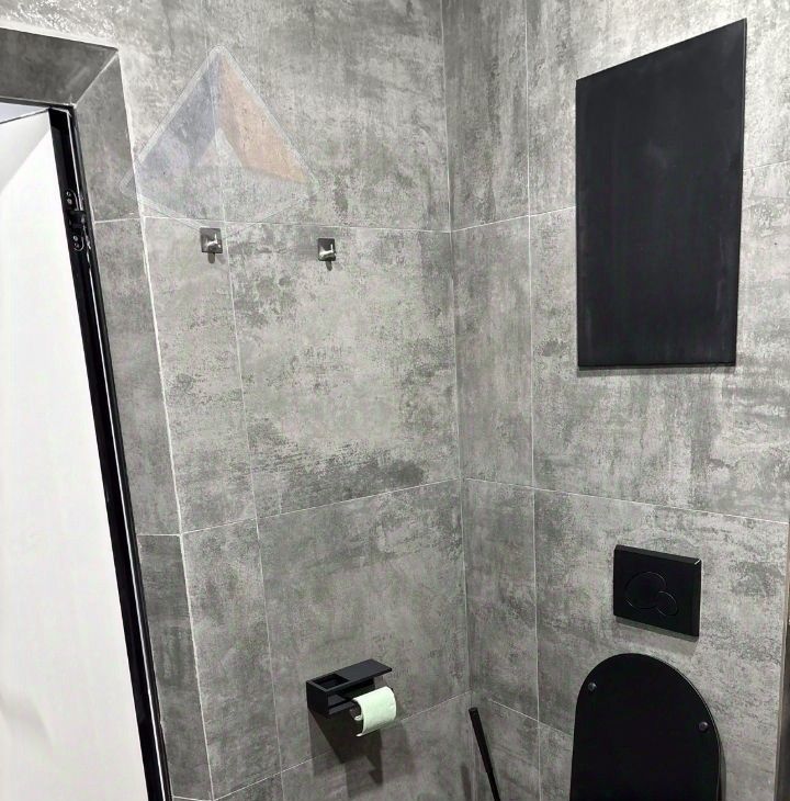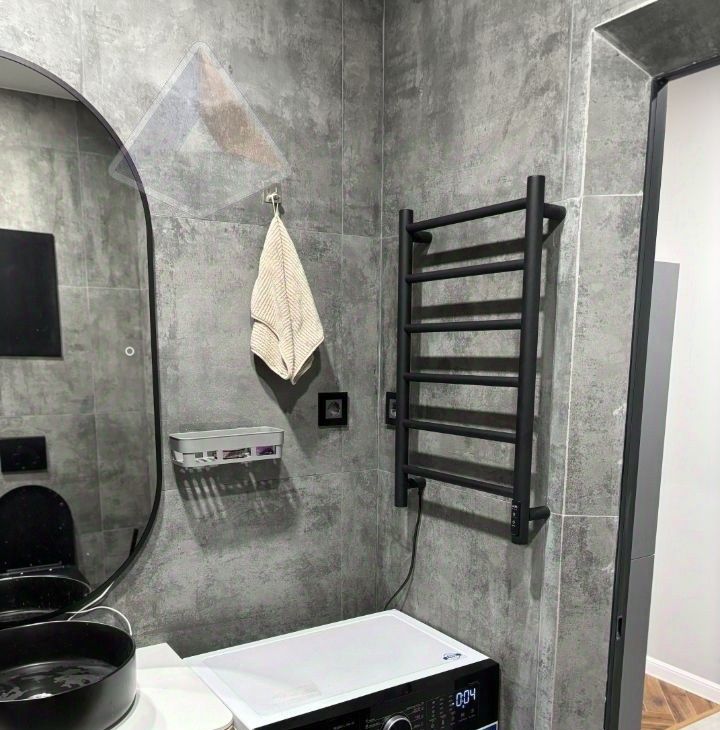 Огромный санузел 5,5 м²: широкоформатный керамогранит "бетон-графит", итальянская стиральная машина DeLonghi с подсветкой, чёрный подвесной унитаз, зеркало с подсветкой.