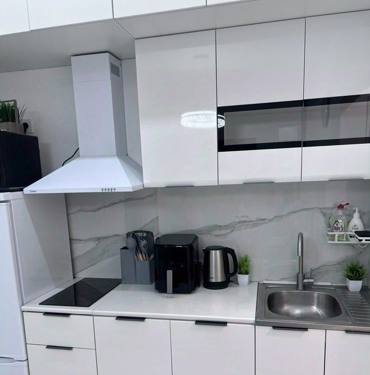 Кухня: большой холодильник, посудомоечная машина, микроволновая печь со встроенной духовкой и грилем, аэрогриль, блендер. Комфорт и технологии: Кондиционер, стиральная машина с функцией сушки, теплые полы на кухне, в коридоре и санузле.