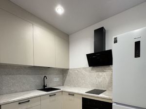 Кухня с встроенным холодильником, духовым шкафом, свч, посудомоечной машиной, индукционной варочной поверхностью и эл. чайником.